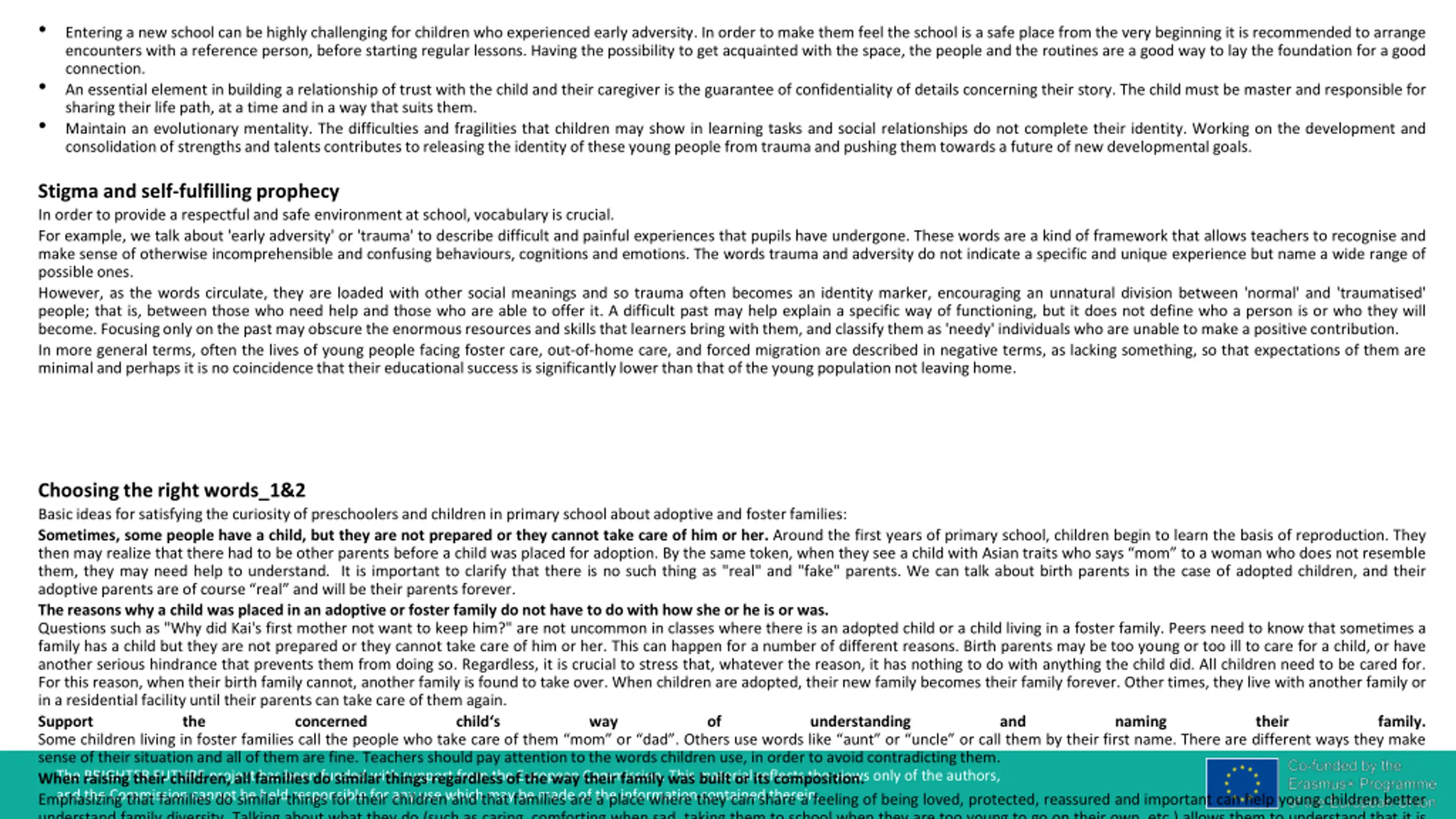 Entering a new school can be highly challenging for children who experienced early adversity. In order to make them feel the school is a safe place from the very beginning it is recommended to arrange encounters with a reference person, before starting regular lessons. Having the possibility to get acquainted with the space, the people and the routines are a good way to lay the foundation for a good connection. An essential element in building a relationship of trust with the child and their caregiver is the guarantee of confidentiality of details concerning their story. The child must be master and responsible for sharing their life path, at a time and in a way that suits them. Maintain an evolutionary mentality. The difficulties and fragilities that children may show in learning tasks and social relationships do not complete their identity. Working on the development and consolidationof strengthsand talentscontributesto releasing the identity of these young people from trauma and pushing them towardsa future of new developmentalgoals. Stigma and self-fulfilling prophecy In order to provide a respectful and safe environmentat school,vocabulary is crucial. For example, we talk about 'early adversity' or 'trauma' to describe difficult and painful experiences that pupils have undergone. These words are a kind of framework that allows teachers to recognise and make sense of otherwise incomprehensible and confusing behaviours, cognitions and emotions. The words trauma and adversity do not indicate a specific and unique experience but name a wide range of possibleones. However, as the words circulate, they are loaded with other social meanings and so trauma often becomes an identity marker, encouraging an unnatural division between 'normal' and 'traumatised' people; that is, between those who need help and those who are able to offer it. A difficult past may help explain a specific way of functioning, but it does not define who a person is or who they will become.Focusingonly on the past may obscure the enormousresourcesand skillsthat learners bring with them, and classify them as 'needy' individuals who are unable to make a positivecontribution. In more general terms, often the lives of young people facing foster care, out-of-home care, and forced migration are described in negative terms, as lacking something, so that expectations of them are minimaland perhaps it is no coincidencethat their educationalsuccessis significantlylower than that of the young populationnot leaving home. Choosing the right words_1&2 Basic ideas for satisfyingthe curiosityof preschoolersand children in primary schoolaboutadoptive and fosterfamilies: Sometimes, some people have a child, but they are not prepared or they cannot take care of him or her. Around the first years of primary school, children begin to learn the basis of reproduction. They then may realize that there had to be other parents before a child was placed for adoption. By the same token, when they see a child with Asian traits who says mom to a woman who does not resemble them, they may need help to understand. It is important to clarify that there is no such thing as "real" and "fake" parents. We can talk about birth parents in the case of adopted children, and their adoptiveparents are of course real and will be their parents forever. The reasons why a child was placed in an adoptive or foster family do not have to do with how she or he is or was. Questions such as "Why did Kai's first mother not want to keep him?" are not uncommon in classes where there is an adopted child or a child living in a foster family. Peers need to know that sometimes a family has a child but they are not prepared or they cannot take care of him or her. This can happen for a number of different reasons. Birth parents may be too young or too ill to care for a child, or have another serious hindrance that prevents them from doing so. Regardless, it is crucial to stress that, whatever the reason, it has nothing to do with anything the child did. All children need to be cared for. For this reason, when their birth family cannot, another family is found to take over. When children are adopted, their new family becomes their family forever. Other times, they live with another family or in a residential facilityuntil their parents can take care of them again. Support the concerned child s way of Some children living in foster families call the people who take care of them mom or dad . Others use words like aunt or uncle or call them by their first name. There are different ways they make sense of their situationand all of them are fine. Teachers shouldpay attentionto the words children use, in order to avoid contradictingthem. When raising their children, all families do similar things regardless of the way their family was built or its composition. understanding and naming their family. The BRIGHTER FUTURE project has been funded with support from the European Commission. This material reflects the views only of the authors, and the Commission cannot be held responsible for any use which may be made of the information contained therein. Emphasizing that families do similar things for their children and that families are a place where they can share a feeling of being loved, protected, reassured and important can help young children better understand family diversity. Talking about what they do (such as caring, comforting when sad, taking them to school when they are too young to go on their own, etc.) allows them to understand that it is