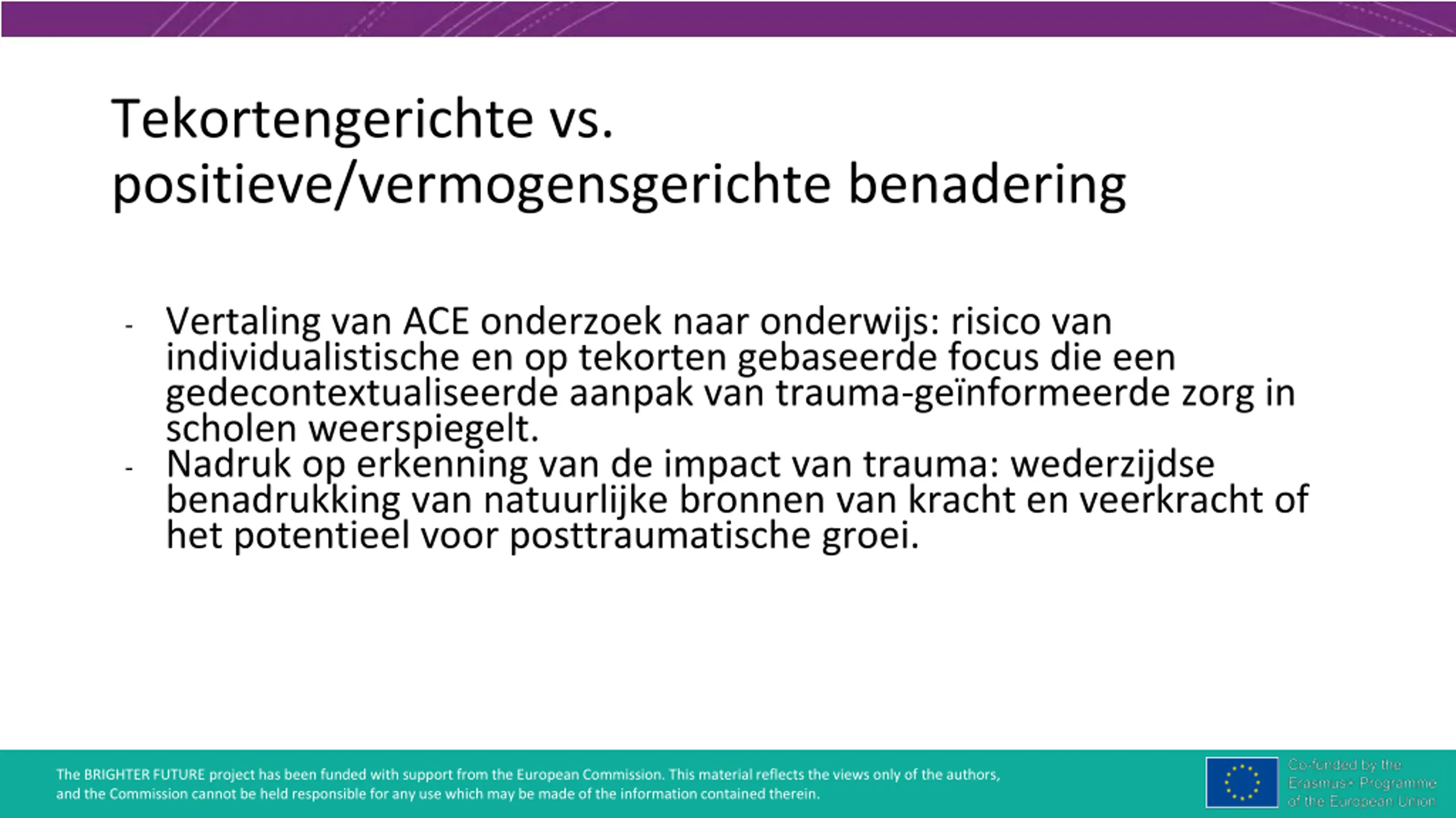 Tekortengerichte vs. positieve/vermogensgerichte benadering - Vertaling van ACE onderzoek naar onderwijs: risico van individualistische en op tekorten gebaseerde focus die een gedecontextualiseerde aanpak van trauma-ge nformeerde zorg in scholen weerspiegelt. - Nadruk op erkenning van de impact van trauma: wederzijdse benadrukking van natuurlijke bronnen van kracht en veerkracht of het potentieel voor posttraumatische groei. The BRIGHTER FUTURE project has been funded with support from the European Commission. This material reflects the views only of the authors, and the Commission cannot be held responsible for any use which may be made of the information contained therein.