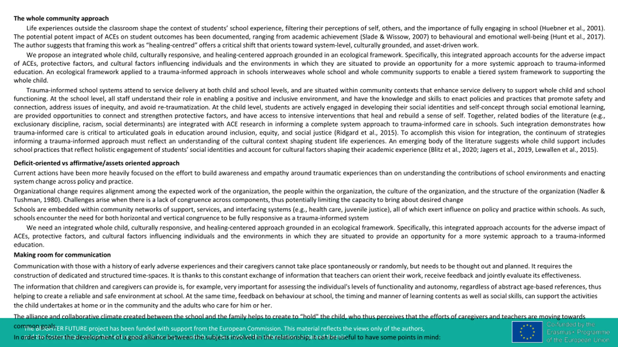 The whole community approach Life experiences outside the classroom shape the context of students school experience, filtering their perceptions of self, others, and the importance of fully engaging in school (Huebner et al., 2001). The potential potent impact of ACEs on student outcomes has been documented, ranging from academic achievement (Slade & Wissow, 2007) to behavioural and emotional well-being (Hunt et al., 2017). The author suggeststhat framing this work as healing-centred offers a critical shift that orients toward system-level,culturally grounded, and asset-drivenwork. We propose an integrated whole child, culturally responsive, and healing-centered approach grounded in an ecological framework. Specifically, this integrated approach accounts for the adverse impact of ACEs, protective factors, and cultural factors influencing individuals and the environments in which they are situated to provide an opportunity for a more systemic approach to trauma-informed education. An ecological framework applied to a trauma-informed approach in schools interweaves whole school and whole community supports to enable a tiered system framework to supporting the whole child. Trauma-informed school systems attend to service delivery at both child and school levels, and are situated within community contexts that enhance service delivery to support whole child and school functioning. At the school level, all staff understand their role in enabling a positive and inclusive environment, and have the knowledge and skills to enact policies and practices that promote safety and connection, address issues of inequity, and avoid re-traumatization. At the child level, students are actively engaged in developing their social identities and self-concept through social emotional learning, are provided opportunities to connect and strengthen protective factors, and have access to intensive interventions that heal and rebuild a sense of self. Together, related bodies of the literature (e.g., exclusionary discipline, racism, social determinants) are integrated with ACE research in informing a complete system approach to trauma-informed care in schools. Such integration demonstrates how trauma-informed care is critical to articulated goals in education around inclusion, equity, and social justice (Ridgard et al., 2015). To accomplish this vision for integration, the continuum of strategies informing a trauma-informed approach must reflect an understanding of the cultural context shaping student life experiences. An emerging body of the literature suggests whole child support includes schoolpractices thatreflect holisticengagementof students socialidentitiesand accountfor cultural factorsshaping their academicexperience (Blitz et al., 2020; Jagers et al., 2019, Lewallen et al., 2015). Deficit-oriented vs affirmative/assets oriented approach Current actions have been more heavily focused on the effort to build awareness and empathy around traumatic experiences than on understanding the contributions of school environments and enacting systemchange acrosspolicy and practice. Organizational change requires alignment among the expected work of the organization, the people within the organization, the culture of the organization, and the structure of the organization (Nadler & Tushman,1980). Challenges arise when there is a lack of congruenceacrosscomponents,thus potentiallylimitingthe capacityto bring aboutdesired change Schools are embedded within community networks of support, services, and interfacing systems (e.g., health care, juvenile justice), all of which exert influence on policy and practice within schools. As such, schoolsencounterthe need for both horizontaland vertical congruenceto be fully responsive as a trauma-informedsystem We need an integrated whole child, culturally responsive, and healing-centered approach grounded in an ecological framework. Specifically, this integrated approach accounts for the adverse impact of ACEs, protective factors, and cultural factors influencing individuals and the environments in which they are situated to provide an opportunity for a more systemic approach to a trauma-informed education. Making room for communication Communication with those with a history of early adverse experiences and their caregivers cannot take place spontaneously or randomly, but needs to be thought out and planned. It requires the construction of dedicated and structured time-spaces. It is thanks to this constant exchange of information that teachers can orient their work, receive feedback and jointly evaluate its effectiveness. The information that children and caregivers can provide is, for example, very important for assessing the individual's levels of functionality and autonomy, regardless of abstract age-based references, thus helping to create a reliable and safe environment at school. At the same time, feedback on behaviour at school, the timing and manner of learning contents as well as social skills, can support the activities the child undertakes at home or in the community and the adults who care for him or her. The alliance and collaborative climate created between the school and the family helps to create to hold" the child, who thus perceives that the efforts of caregivers and teachers are moving towards common goals. The BRIGHTER FUTURE project has been funded with support from the European Commission. This material reflects the views only of the authors, and the Commission cannot be held responsible for any use which may be made of the information contained therein. In order to foster the development of a good alliance between the subjects involved in the relationship, it can be useful to have some points in mind:
