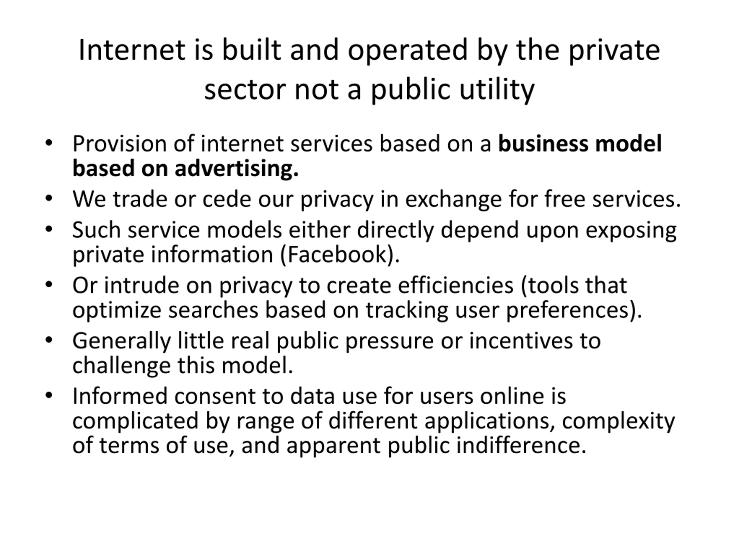 Internet is built and operated by the private sector not a public utility Provision of internet services based on a business model based on advertising. We trade or cede our privacy in exchange for free services. Such service models either directly depend upon exposing private information (Facebook). Or intrude on privacy to create efficiencies (tools that optimize searches based on tracking user preferences). Generally little real public pressure or incentives to challenge this model. Informed consent to data use for users online is complicated by range of different applications, complexity of terms of use, and apparent public indifference.