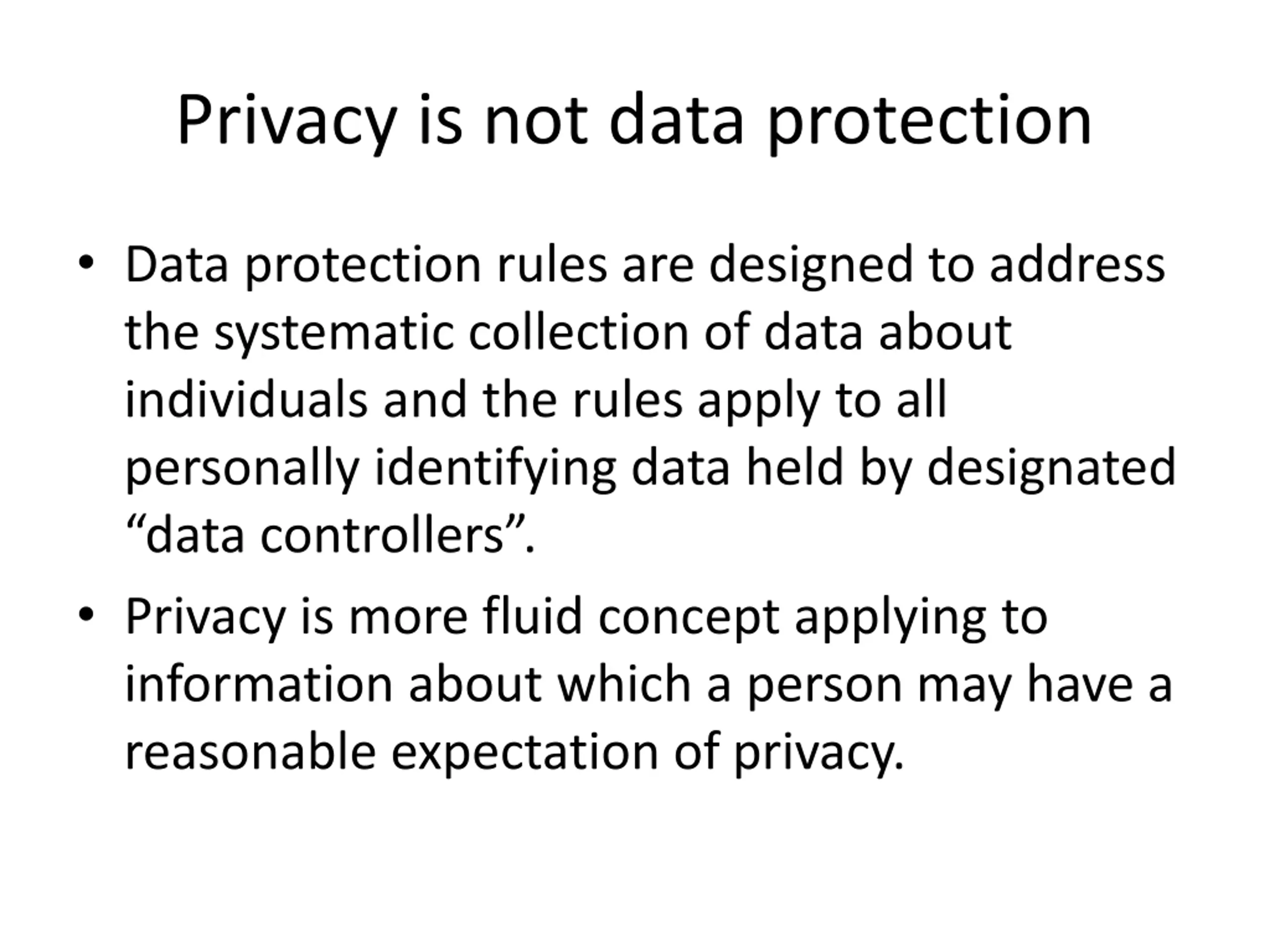 Privacy is not data protection Data protection rules are designed to address the systematic collection of data about individuals and the rules apply to all personally identifying data held by designated data controllers . Privacy is more fluid concept applying to information about which a person may have a reasonable expectation of privacy.
