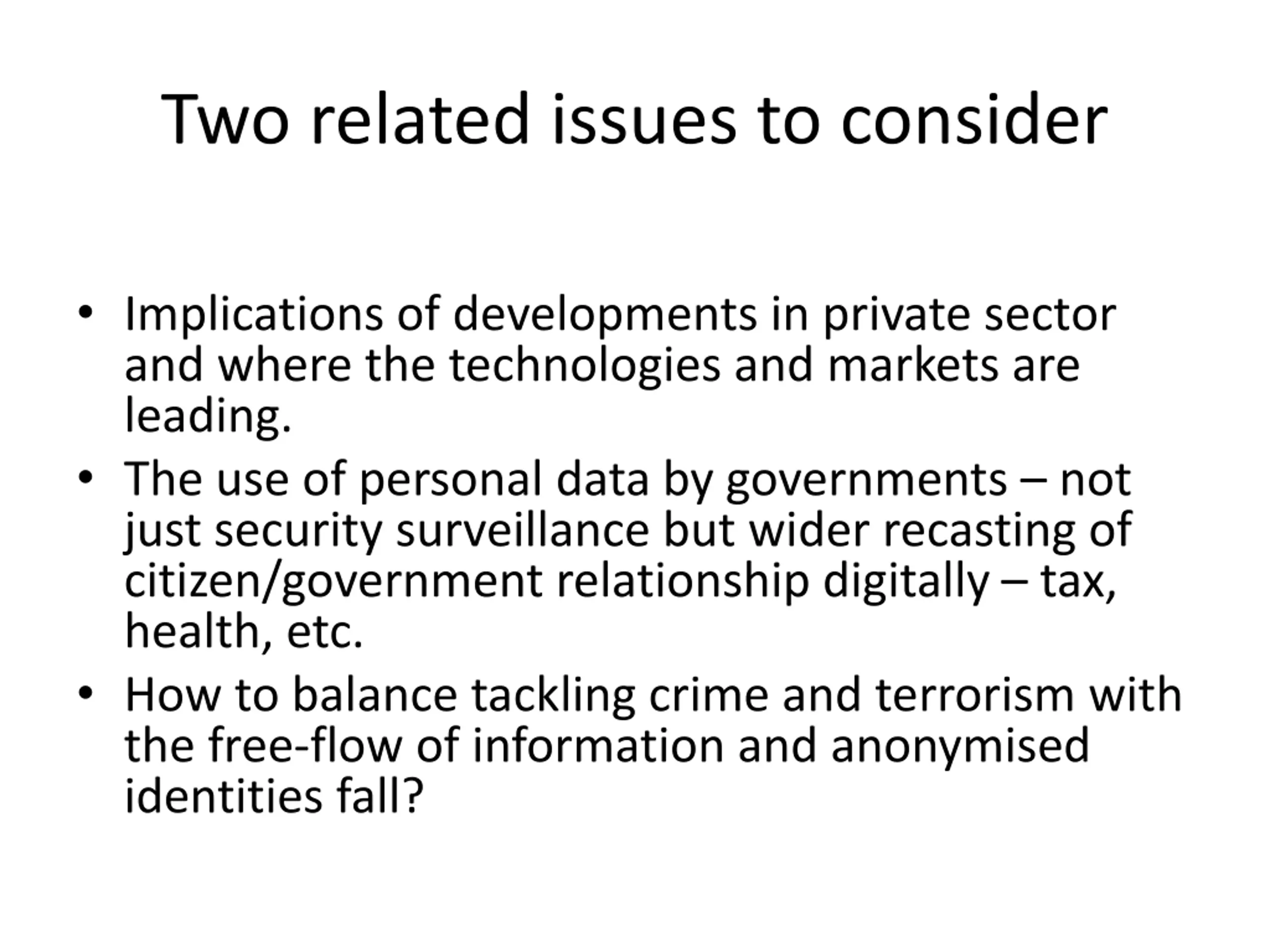 Two related issues to consider Implications of developments in private sector and where the technologies and markets are leading. The use of personal data by governments not just security surveillance but wider recasting of citizen/government relationship digitally tax, health, etc. How to balance tackling crime and terrorism with the free-flow of information and anonymised identities fall?