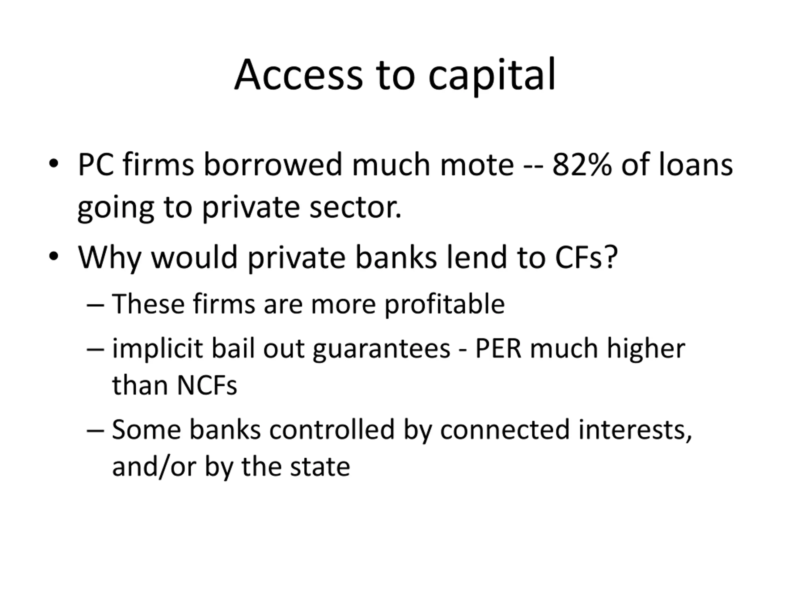 Access to capital PC firms borrowed much mote -- 82% of loans going to private sector. Why would private banks lend to CFs? These firms are more profitable implicit bail out guarantees - PER much higher than NCFs Some banks controlled by connected interests, and/or by the state