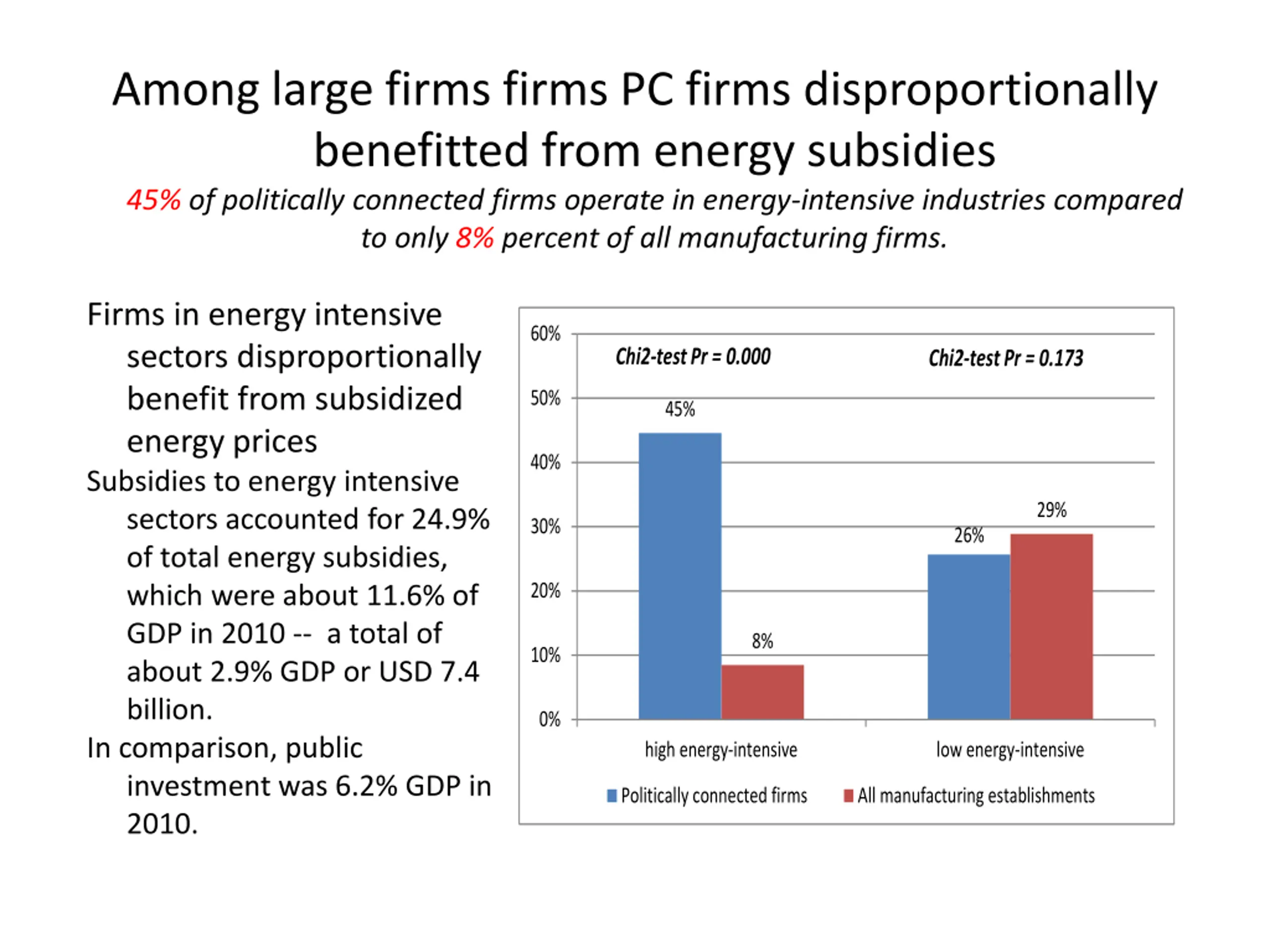 Among large firms firms PC firms disproportionally benefitted from energy subsidies 45% of politically connected firms operate in energy-intensive industries compared to only 8% percent of all manufacturing firms. Firms in energy intensive sectors disproportionally benefit from subsidized energy prices Subsidies to energy intensive sectors accounted for 24.9% of total energy subsidies, which were about 11.6% of GDP in 2010 -- a total of about 2.9% GDP or USD 7.4 billion. In comparison, public investment was 6.2% GDP in 2010. 60% Chi2-test Pr = 0.000 Chi2-test Pr = 0.173 50% 45% 40% 29% 30% 26% 20% 8% 10% 0% high energy-intensive low energy-intensive Politically connected firms All manufacturing establishments