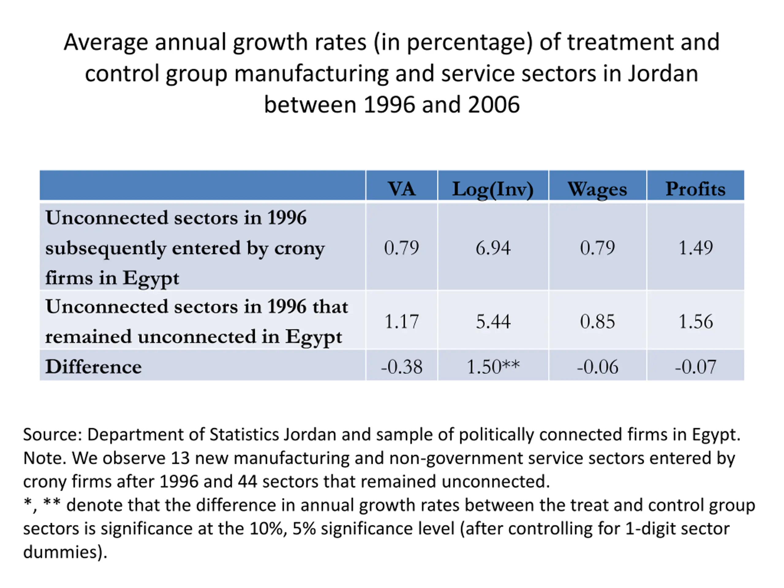 Average annual growth rates (in percentage) of treatment and control group manufacturing and service sectors in Jordan between 1996 and 2006 VA Log(Inv) Wages Profits Unconnected sectors in 1996 subsequently entered by crony firms in Egypt Unconnected sectors in 1996 that remained unconnected in Egypt Difference 0.79 6.94 0.79 1.49 1.17 5.44 0.85 1.56 -0.38 1.50** -0.06 -0.07 Source: Department of Statistics Jordan and sample of politically connected firms in Egypt. Note. We observe 13 new manufacturing and non-government service sectors entered by crony firms after 1996 and 44 sectors that remained unconnected. *, ** denote that the difference in annual growth rates between the treat and control group sectors is significance at the 10%, 5% significance level (after controlling for 1-digit sector dummies).