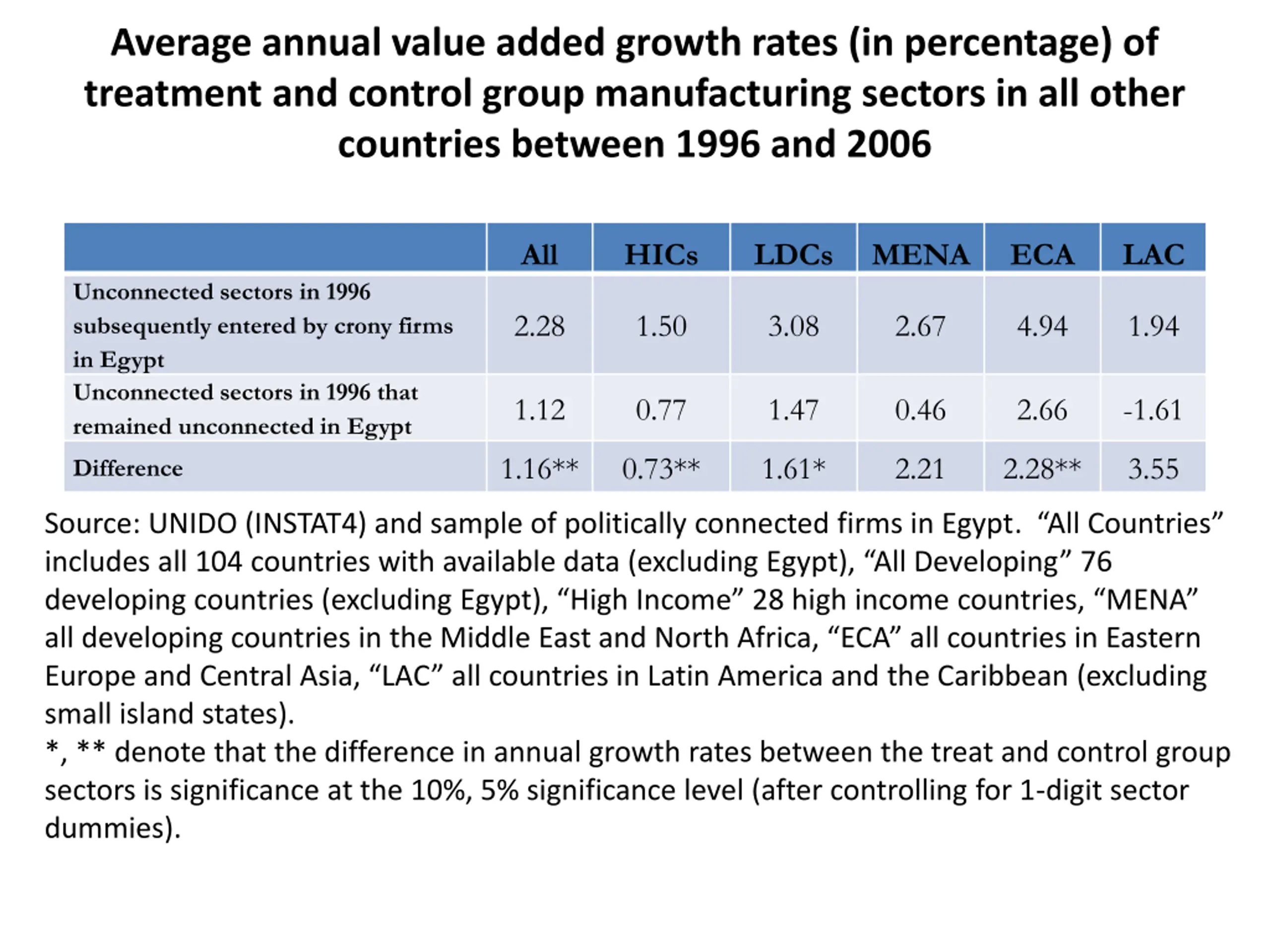 Average annual value added growth rates (in percentage) of treatment and control group manufacturing sectors in all other countries between 1996 and 2006 All HICs LDCs MENA ECA LAC Unconnected sectors in 1996 subsequently entered by crony firms in Egypt Unconnected sectors in 1996 that remained unconnected in Egypt 2.28 1.50 3.08 2.67 4.94 1.94 1.12 0.77 1.47 0.46 2.66 -1.61 1.16** 0.73** 1.61* 2.21 2.28** 3.55 Difference Source: UNIDO (INSTAT4) and sample of politically connected firms in Egypt. All Countries includes all 104 countries with available data (excluding Egypt), All Developing 76 developing countries (excluding Egypt), High Income 28 high income countries, MENA all developing countries in the Middle East and North Africa, ECA all countries in Eastern Europe and Central Asia, LAC all countries in Latin America and the Caribbean (excluding small island states). *, ** denote that the difference in annual growth rates between the treat and control group sectors is significance at the 10%, 5% significance level (after controlling for 1-digit sector dummies).