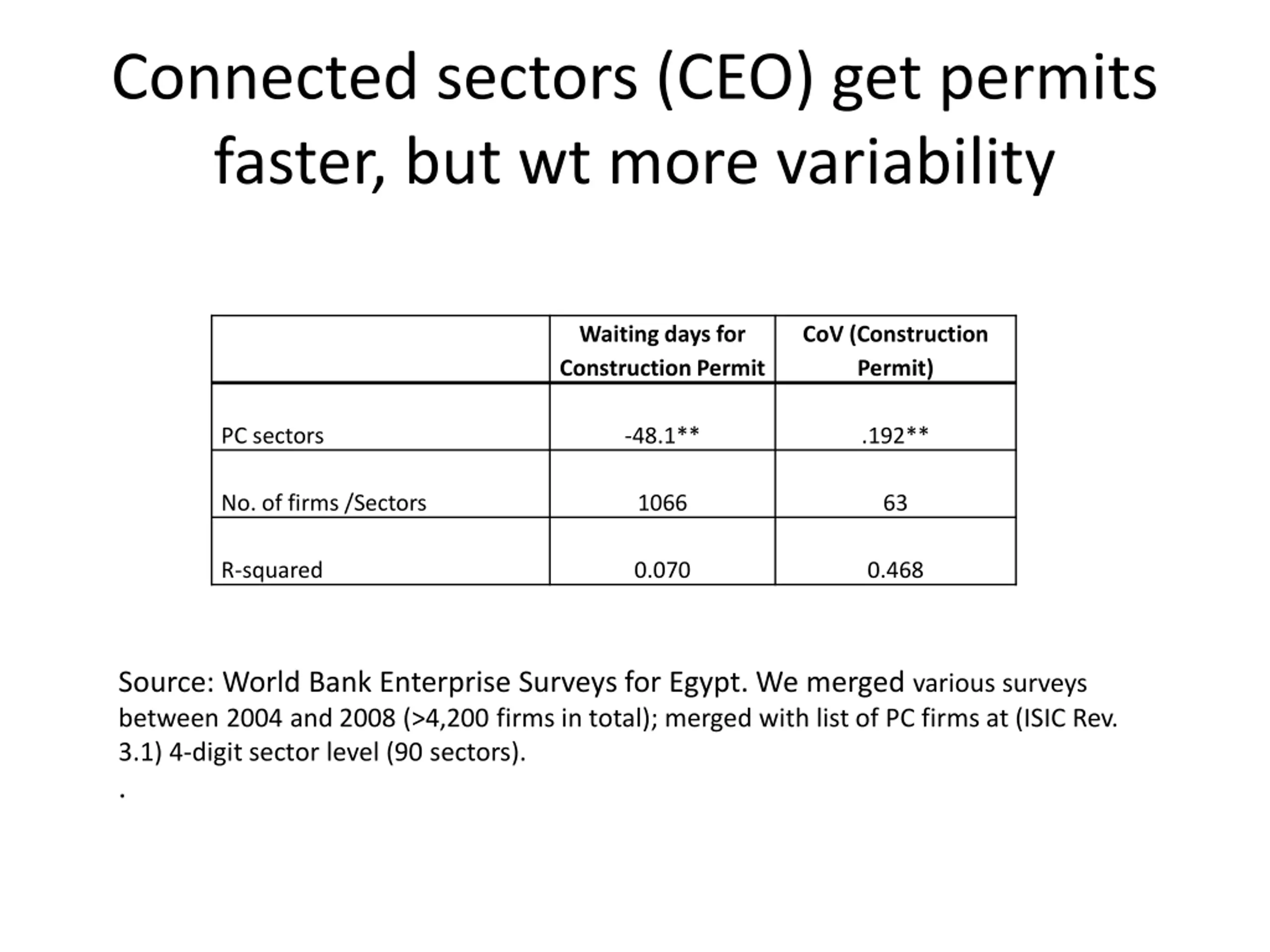 Connected sectors (CEO) get permits faster, but wt more variability Waiting days for Construction Permit CoV (Construction Permit) PC sectors -48.1** .192** No. of firms /Sectors 1066 63 R-squared 0.070 0.468 Source: World Bank Enterprise Surveys for Egypt. We merged various surveys between 2004 and 2008 (>4,200 firms in total); merged with list of PC firms at (ISIC Rev. 3.1) 4-digit sector level (90 sectors). .