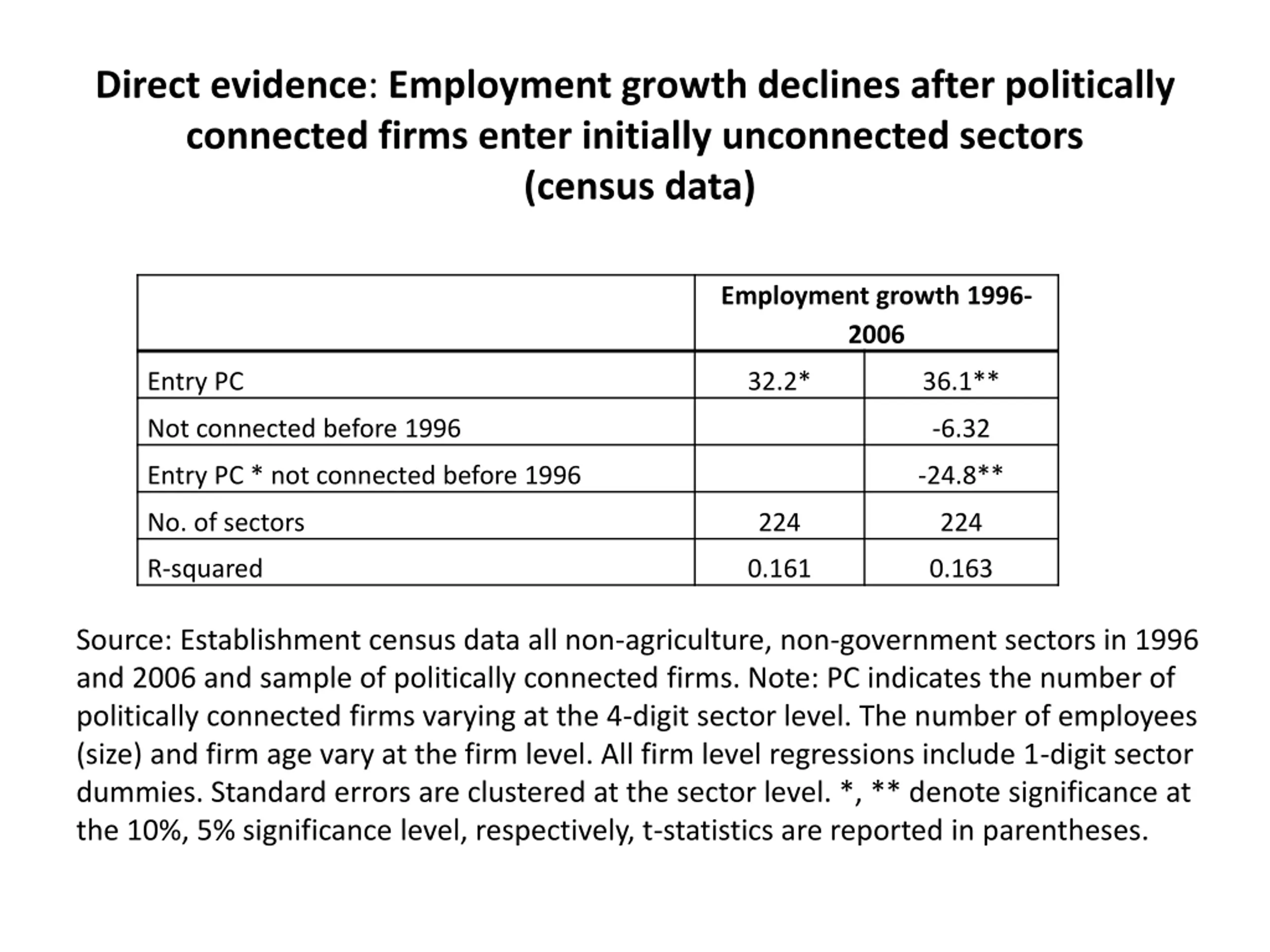 Direct evidence: Employment growth declines after politically connected firms enter initially unconnected sectors (census data) Employment growth 1996- 2006 Entry PC 32.2* 36.1** Not connected before 1996 -6.32 Entry PC * not connected before 1996 -24.8** No. of sectors 224 224 R-squared 0.161 0.163 Source: Establishment census data all non-agriculture, non-government sectors in 1996 and 2006 and sample of politically connected firms. Note: PC indicates the number of politically connected firms varying at the 4-digit sector level. The number of employees (size) and firm age vary at the firm level. All firm level regressions include 1-digit sector dummies. Standard errors are clustered at the sector level. *, ** denote significance at the 10%, 5% significance level, respectively, t-statistics are reported in parentheses.