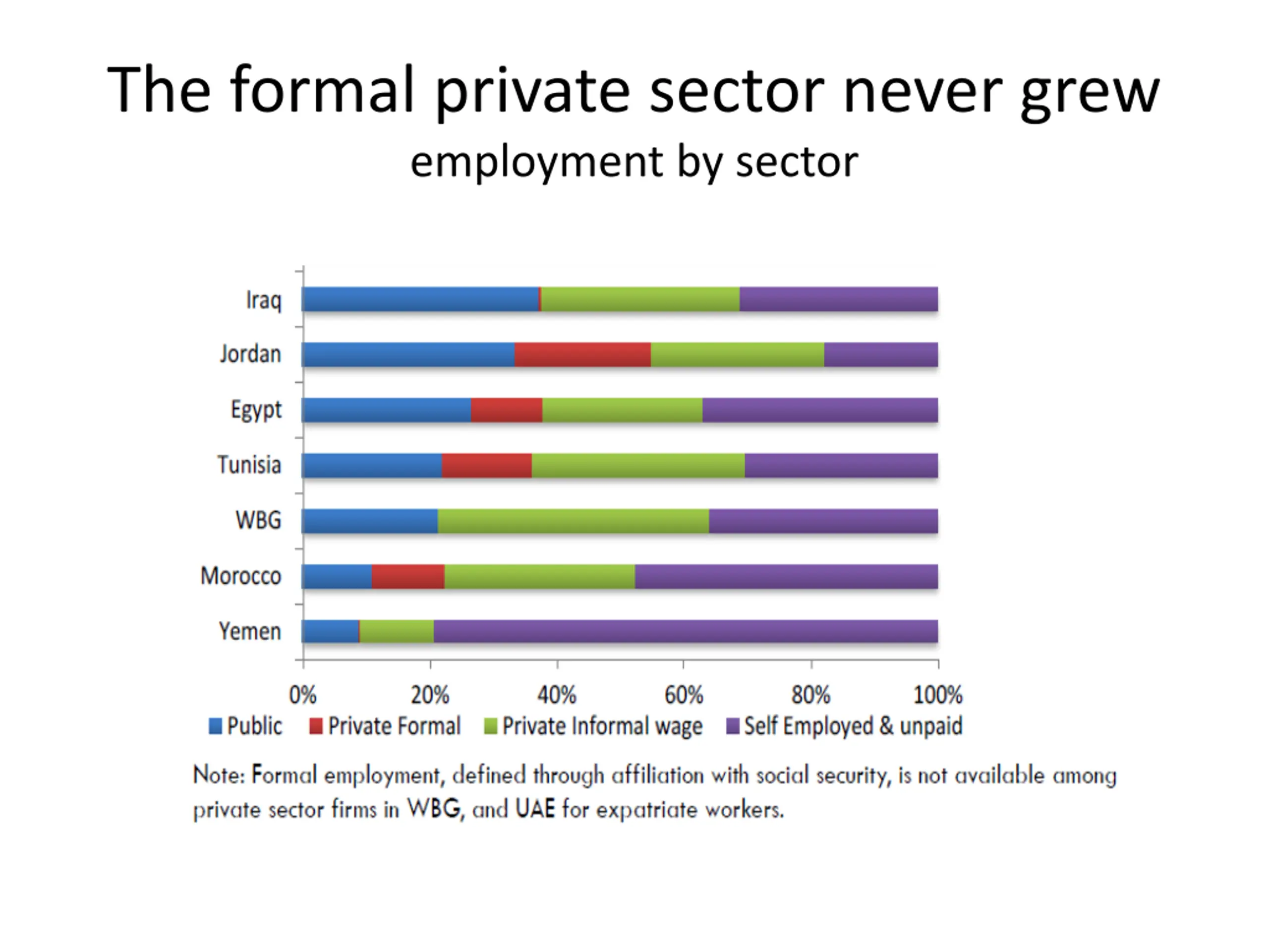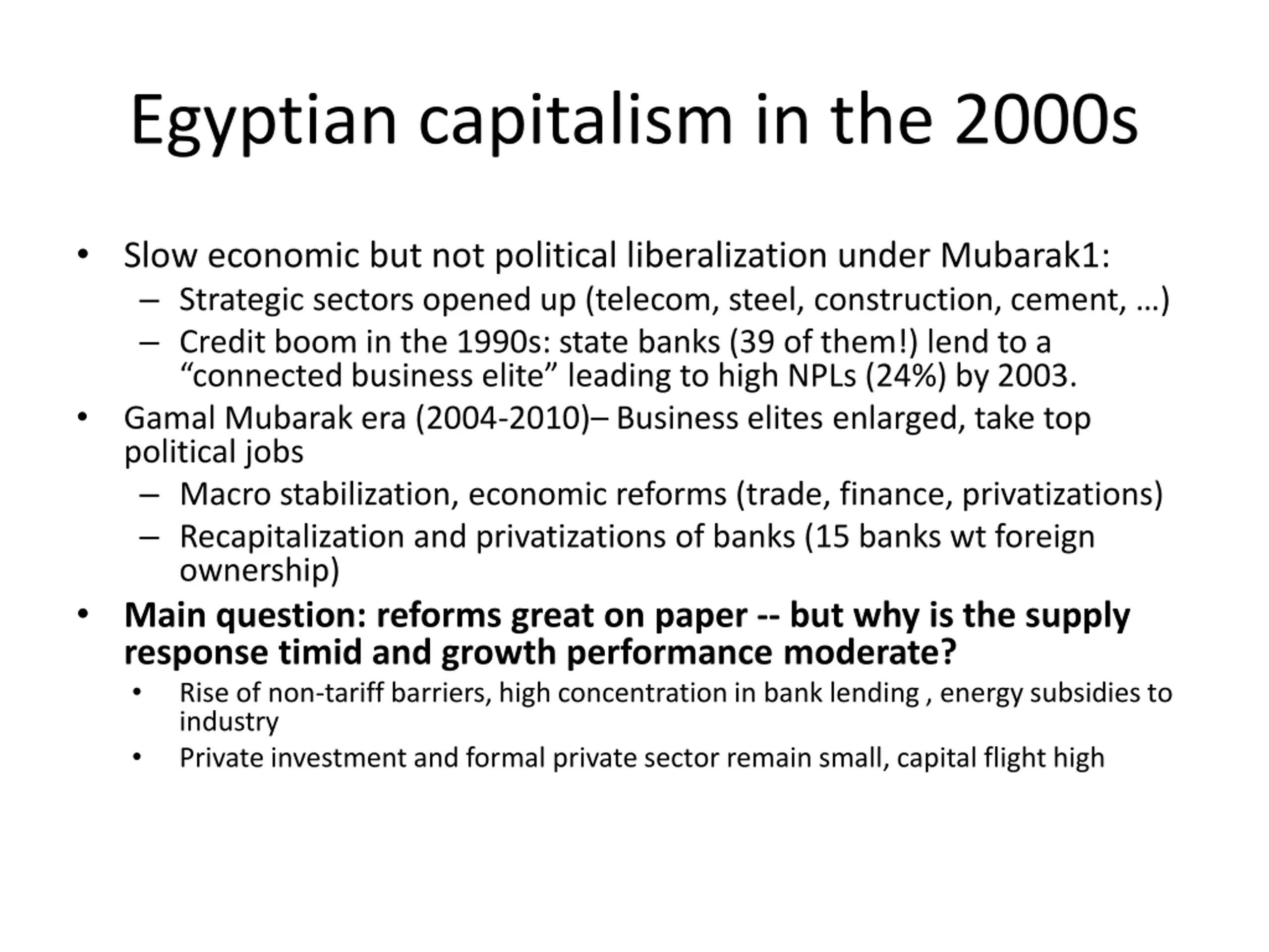 Egyptian capitalism in the 2000s Slow economic but not political liberalization under Mubarak1: Strategic sectors opened up (telecom, steel, construction, cement, ) Credit boom in the 1990s: state banks (39 of them!) lend to a connected business elite leading to high NPLs (24%) by 2003. Gamal Mubarak era (2004-2010) Business elites enlarged, take top political jobs Macro stabilization, economic reforms (trade, finance, privatizations) Recapitalization and privatizations of banks (15 banks wt foreign ownership) Main question: reforms great on paper -- but why is the supply response timid and growth performance moderate? Rise of non-tariff barriers, high concentration in bank lending , energy subsidies to industry Private investment and formal private sector remain small, capital flight high