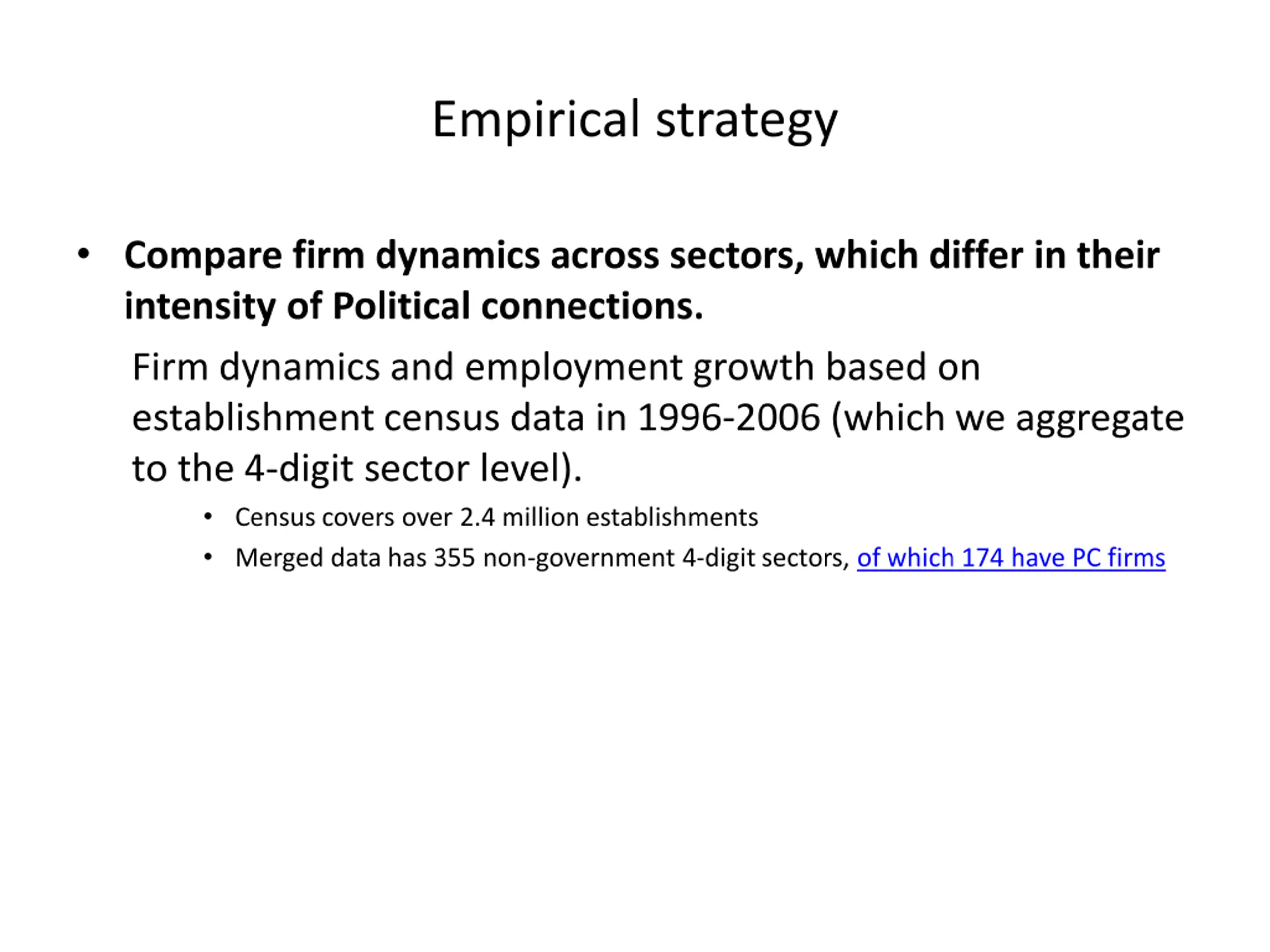 Empirical strategy Compare firm dynamics across sectors, which differ in their intensity of Political connections. Firm dynamics and employment growth based on establishment census data in 1996-2006 (which we aggregate to the 4-digit sector level). Census covers over 2.4 million establishments Merged data has 355 non-government 4-digit sectors, of which 174 have PC firms