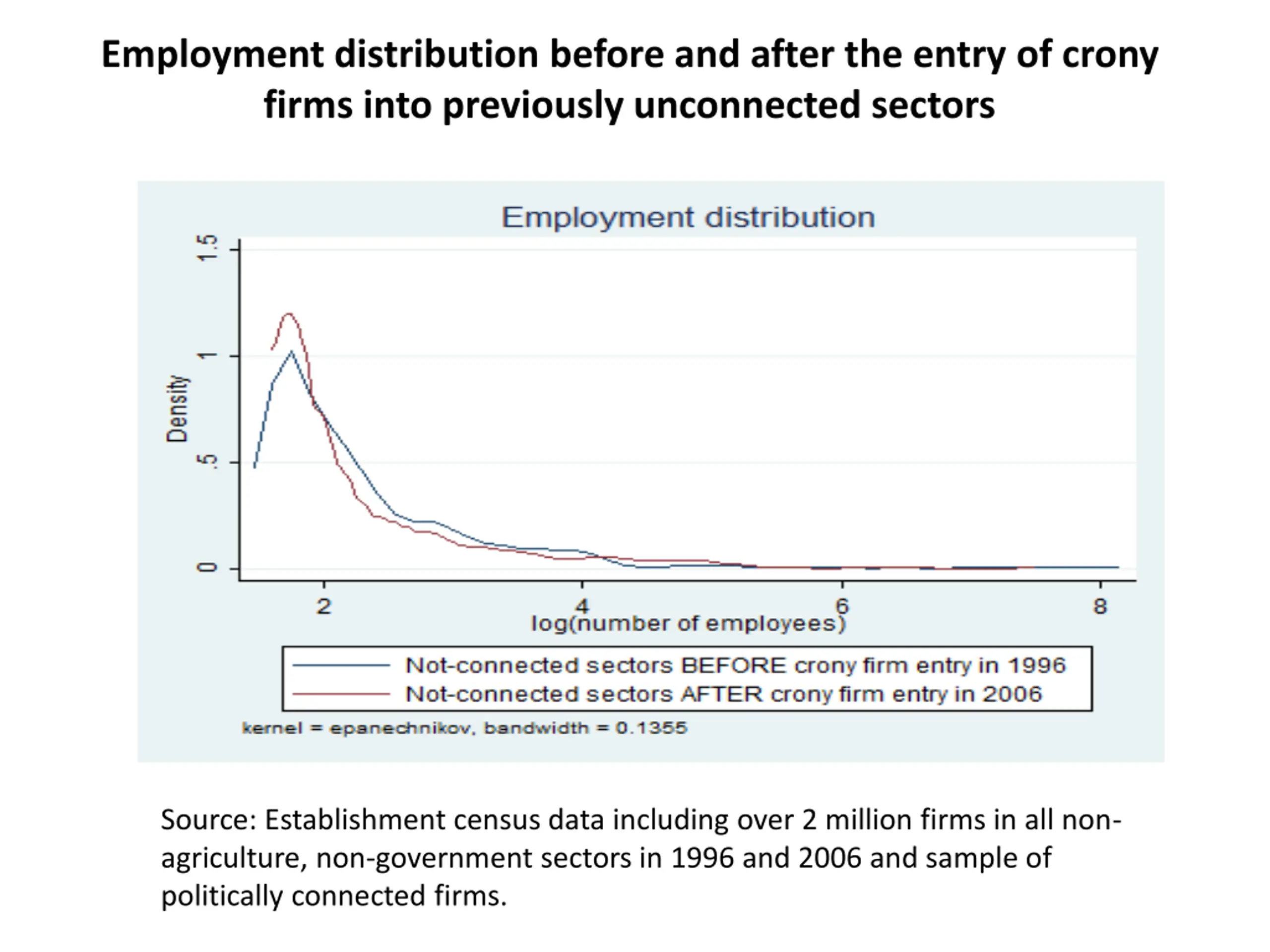 Employment distribution before and after the entry of crony firms into previously unconnected sectors Source: Establishment census data including over 2 million firms in all non- agriculture, non-government sectors in 1996 and 2006 and sample of politically connected firms.