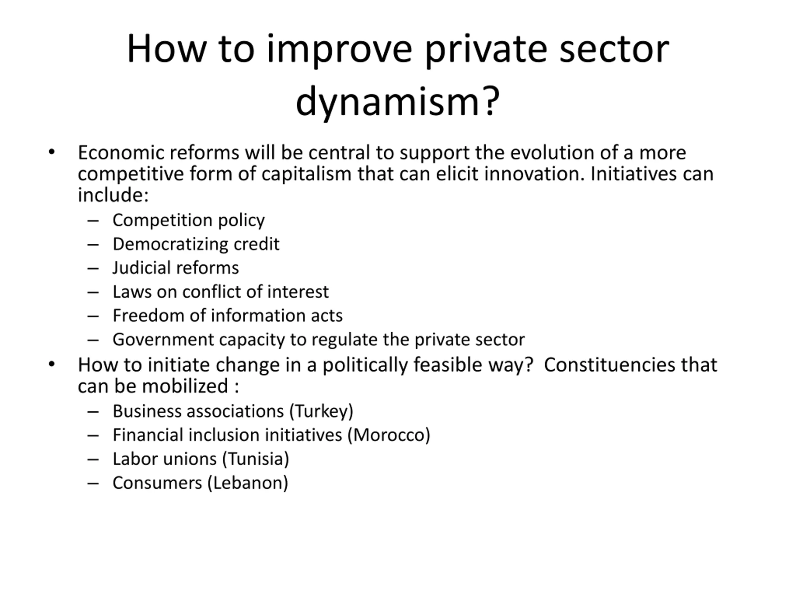How to improve private sector dynamism? Economic reforms will be central to support the evolution of a more competitive form of capitalism that can elicit innovation. Initiatives can include: Competition policy Democratizing credit Judicial reforms Laws on conflict of interest Freedom of information acts Government capacity to regulate the private sector How to initiate change in a politically feasible way? Constituencies that can be mobilized : Business associations (Turkey) Financial inclusion initiatives (Morocco) Labor unions (Tunisia) Consumers (Lebanon)