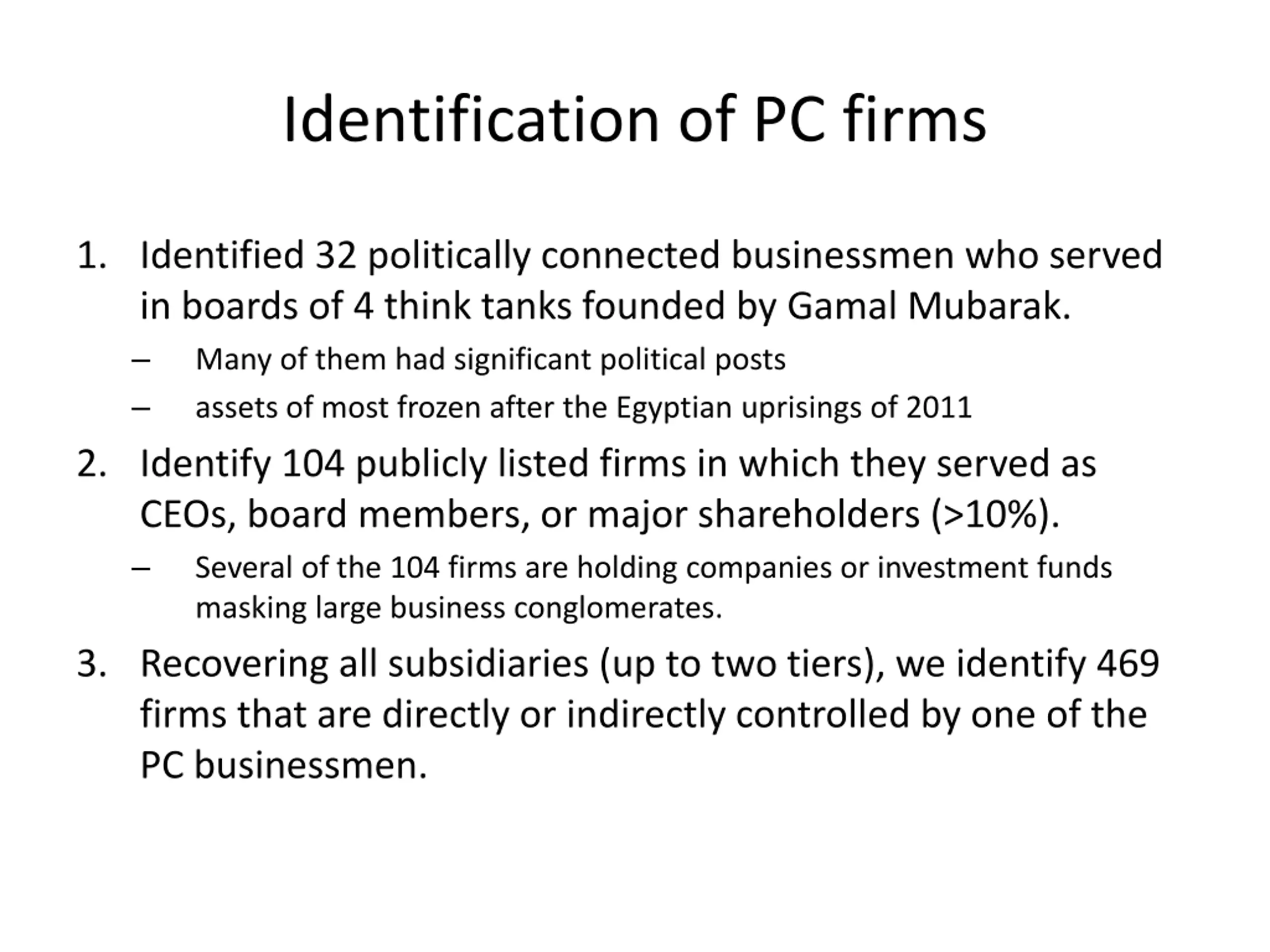 Identification of PC firms 1. Identified 32 politically connected businessmen who served in boards of 4 think tanks founded by Gamal Mubarak. Many of them had significant political posts assets of most frozen after the Egyptian uprisings of 2011 2. Identify 104 publicly listed firms in which they served as CEOs, board members, or major shareholders (>10%). Several of the 104 firms are holding companies or investment funds masking large business conglomerates. 3. Recovering all subsidiaries (up to two tiers), we identify 469 firms that are directly or indirectly controlled by one of the PC businessmen.