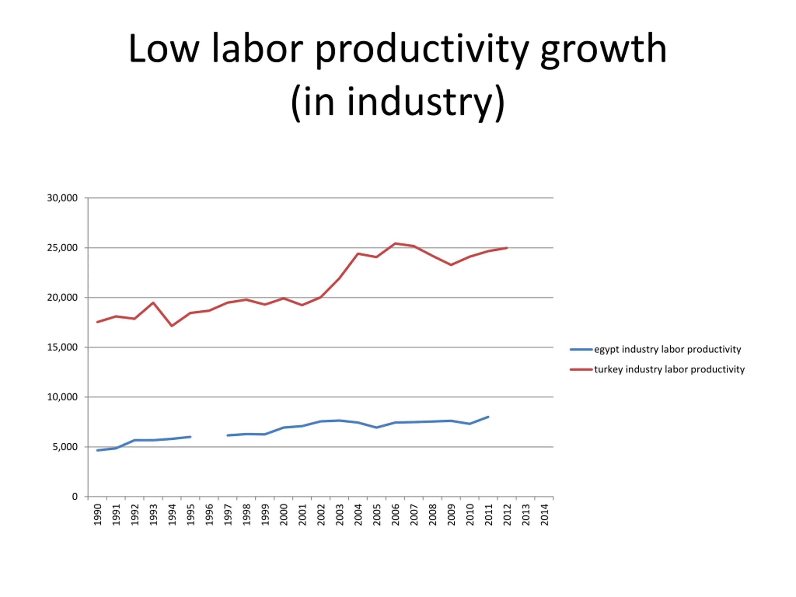 Low labor productivity growth (in industry) 30,000 25,000 20,000 15,000 egypt industry labor productivity turkey industry labor productivity 10,000 5,000 0 1990 1991 1992 1993 1994 1995 1996 1997 1998 1999 2000 2001 2002 2003 2004 2005 2006 2007 2008 2009 2010 2011 2012 2013 2014