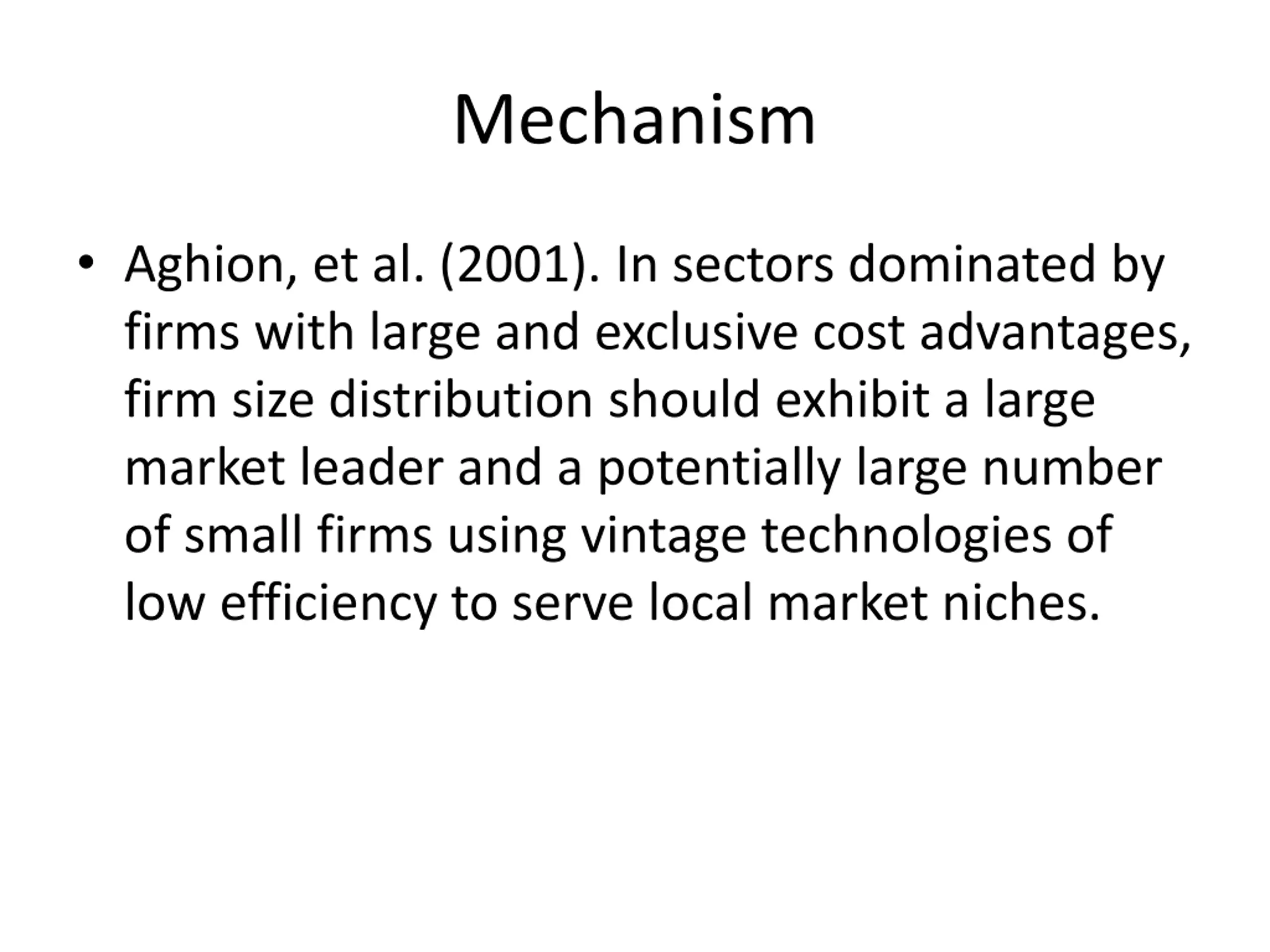 Mechanism Aghion, et al. (2001). In sectors dominated by firms with large and exclusive cost advantages, firm size distribution should exhibit a large market leader and a potentially large number of small firms using vintage technologies of low efficiency to serve local market niches.