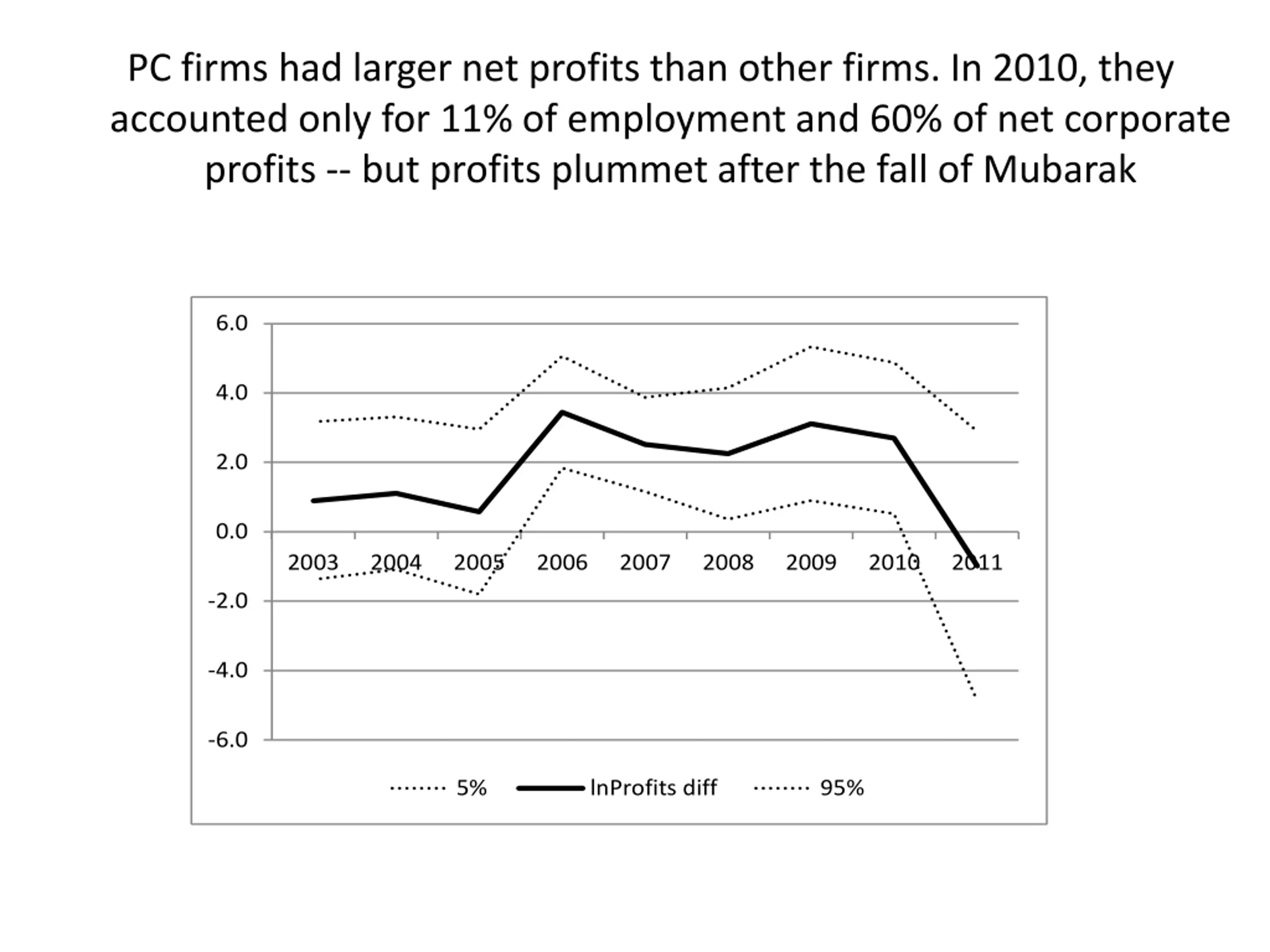 PC firms had larger net profits than other firms. In 2010, they accounted only for 11% of employment and 60% of net corporate profits -- but profits plummet after the fall of Mubarak 6.0 4.0 2.0 0.0 2003 2004 2005 2006 2007 2008 2009 2010 2011 -2.0 -4.0 -6.0 5% lnProfits diff 95%