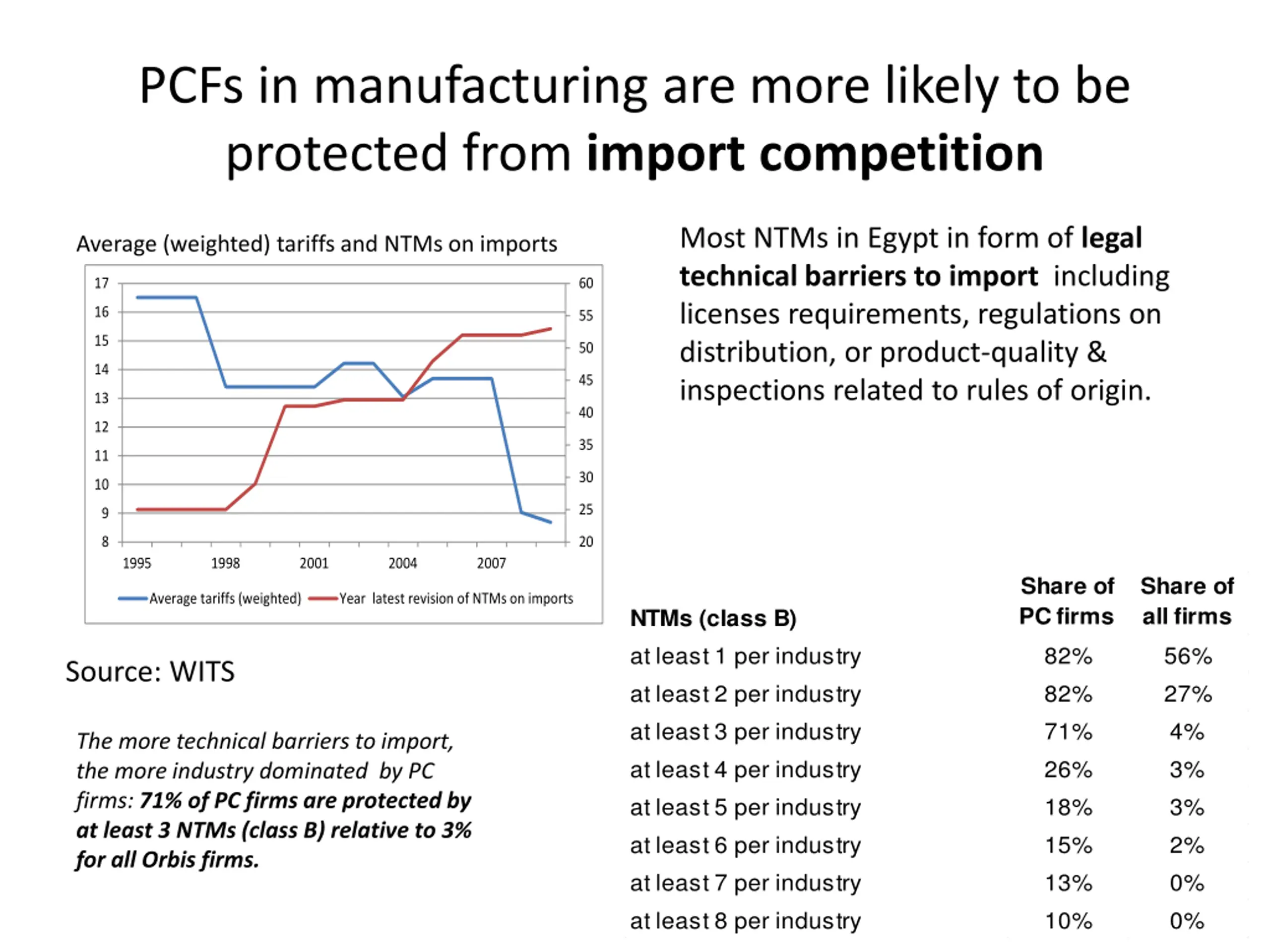 PCFs in manufacturing are more likely to be protected from import competition Most NTMs in Egypt in form of legal technical barriers to import including licenses requirements, regulations on distribution, or product-quality & inspections related to rules of origin. Average (weighted) tariffs and NTMs on imports 17 60 16 55 15 50 14 45 13 40 12 35 11 30 10 25 9 8 20 1995 1998 2001 2004 2007 Share of PC firms Share of all firms Average tariffs (weighted) Year latest revision of NTMs on imports NTMs (class B) at least 1 per industry at least 2 per industry at least 3 per industry at least 4 per industry at least 5 per industry at least 6 per industry at least 7 per industry at least 8 per industry 82% 82% 71% 26% 18% 15% 13% 10% 56% 27% 4% 3% 3% 2% 0% 0% Source: WITS The more technical barriers to import, the more industry dominated by PC firms: 71% of PC firms are protected by at least 3 NTMs (class B) relative to 3% for all Orbis firms.
