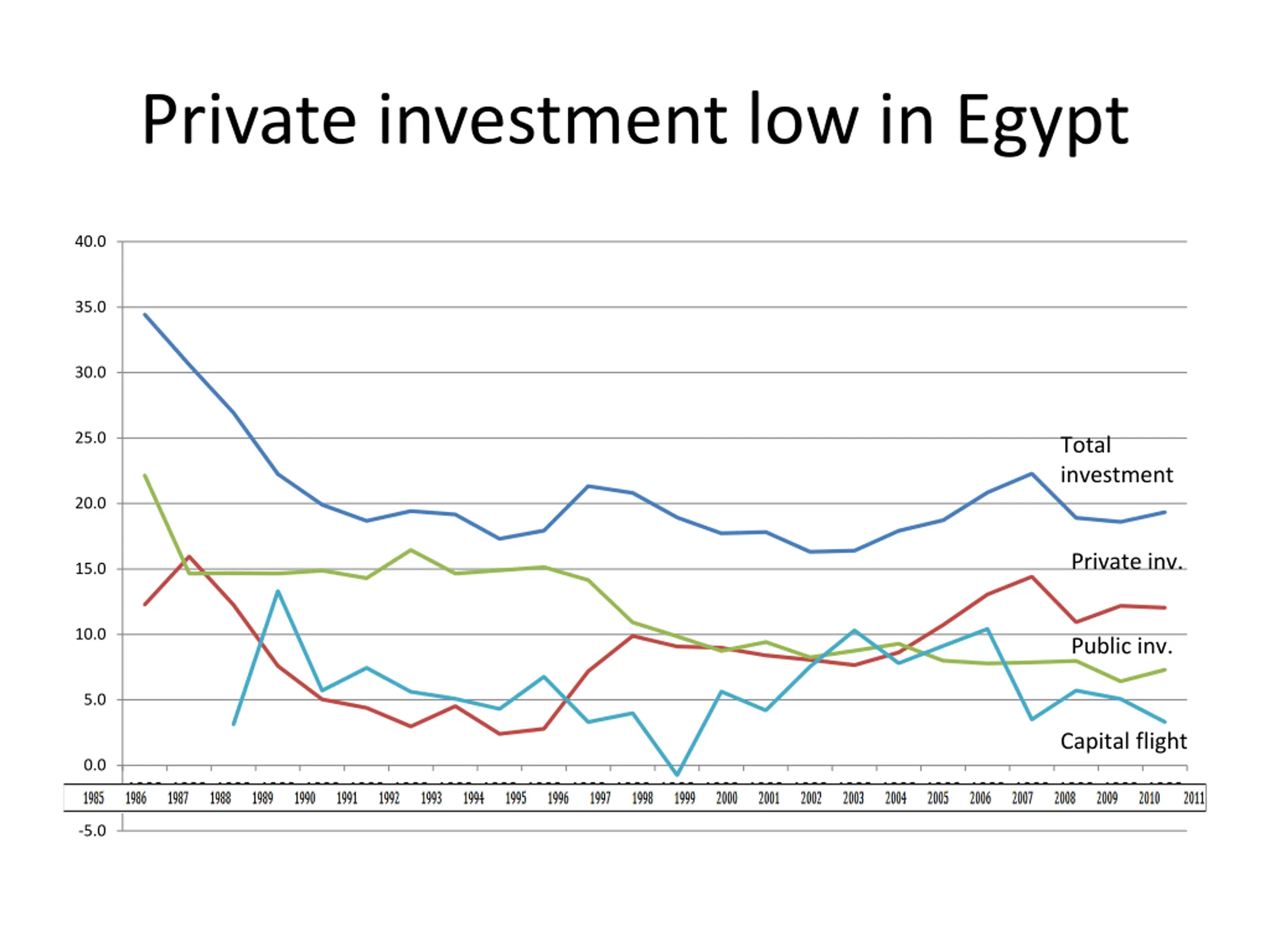 Private investment low in Egypt 40.0 35.0 30.0 25.0 Total investment 20.0 Private inv. 15.0 10.0 Public inv. 5.0 Capital flight 0.0 1900 1900 1900 1900 1900 1900 1900 1900 1900 1900 1900 1900 1900 1900 1900 1900 1900 1900 1900 1900 1900 1900 1900 1900 -5.0