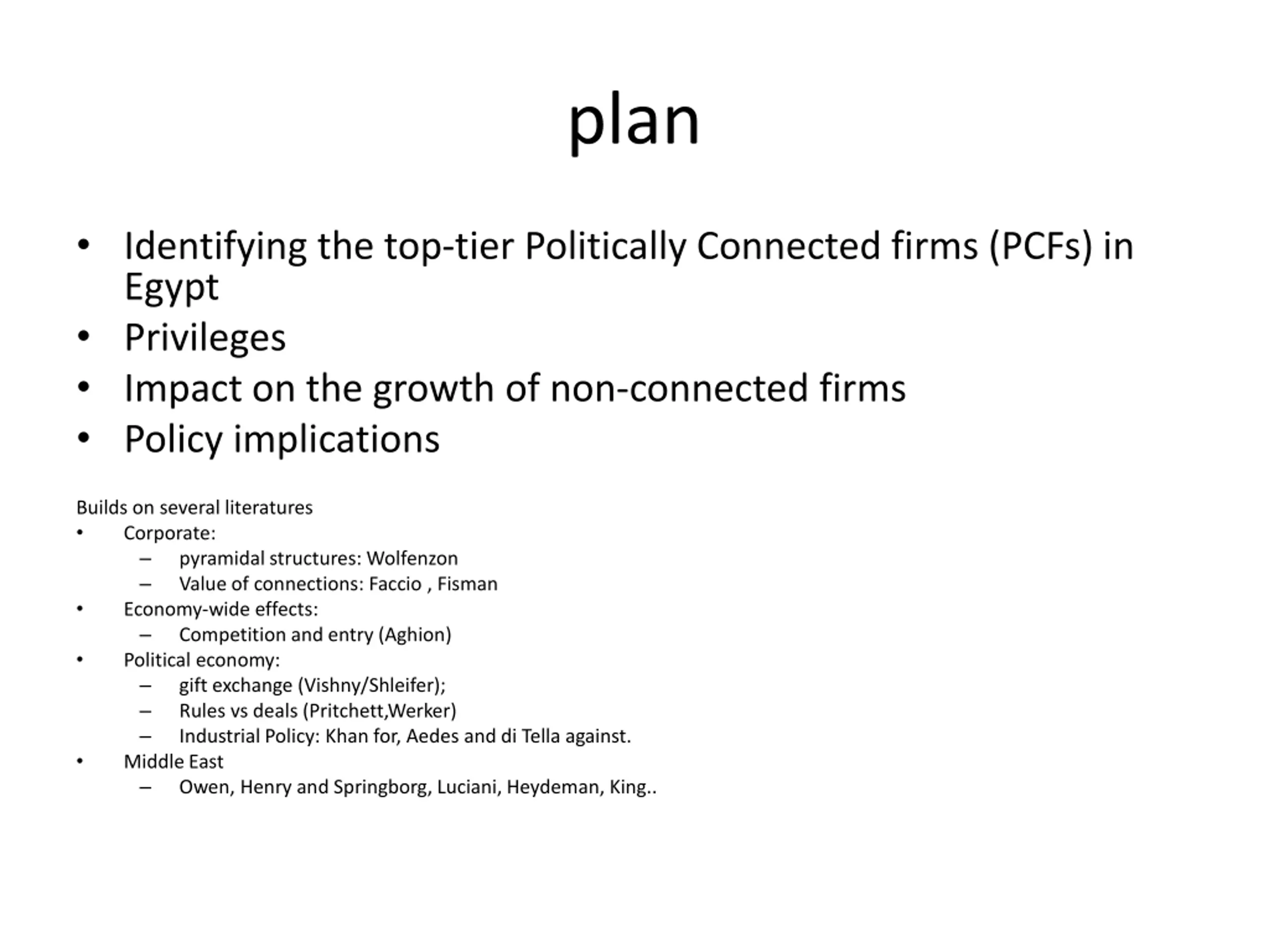 plan Identifying the top-tier Politically Connected firms (PCFs) in Egypt Privileges Impact on the growth of non-connected firms Policy implications Builds on several literatures Corporate: pyramidal structures: Wolfenzon Value of connections: Faccio , Fisman Economy-wide effects: Competition and entry (Aghion) Political economy: gift exchange (Vishny/Shleifer); Rules vs deals (Pritchett,Werker) Industrial Policy: Khan for, Aedes and di Tella against. Middle East Owen, Henry and Springborg, Luciani, Heydeman, King..