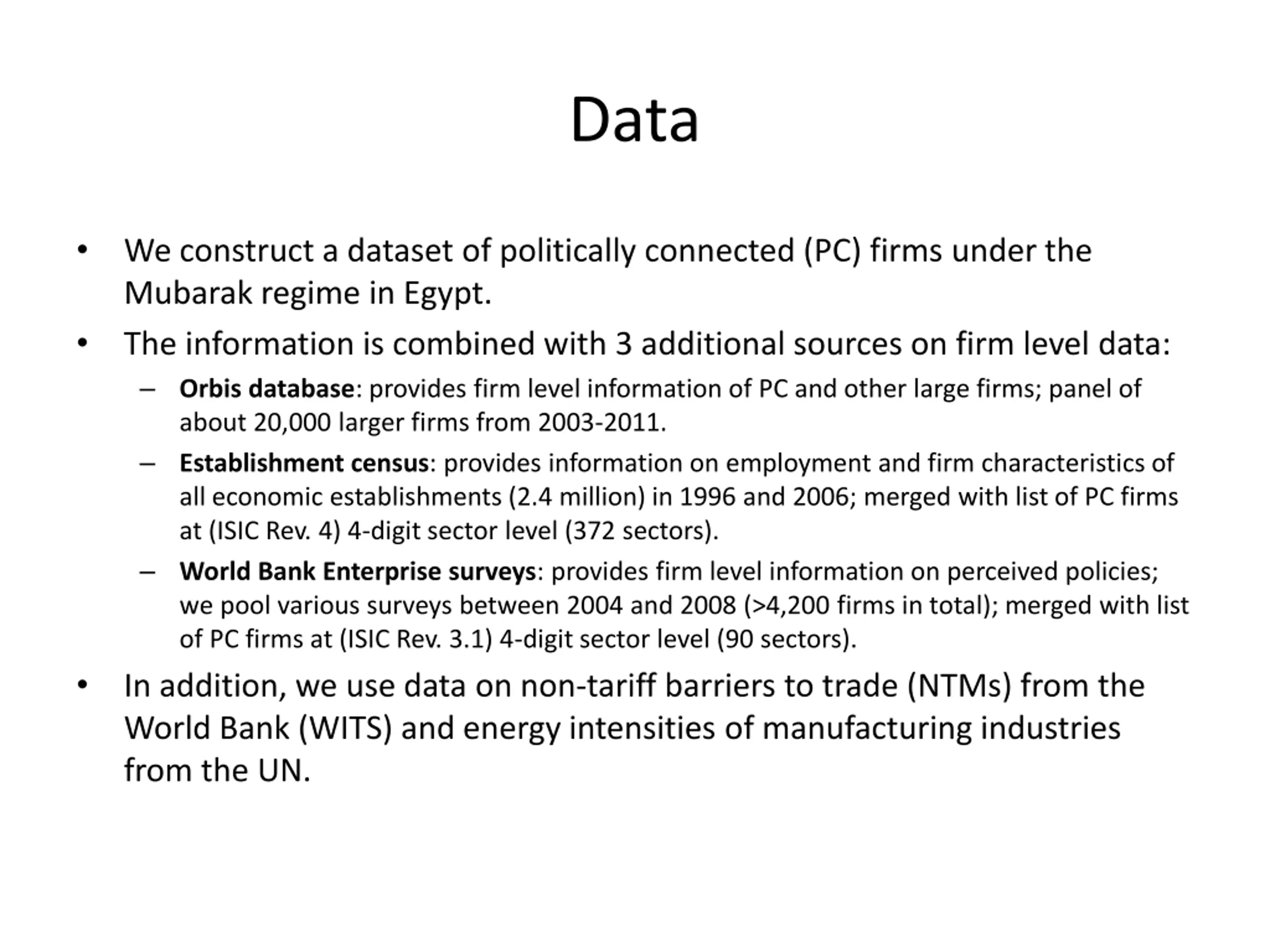 Data We construct a dataset of politically connected (PC) firms under the Mubarak regime in Egypt. The information is combined with 3 additional sources on firm level data: Orbis database: provides firm level information of PC and other large firms; panel of about 20,000 larger firms from 2003-2011. Establishment census: provides information on employment and firm characteristics of all economic establishments (2.4 million) in 1996 and 2006; merged with list of PC firms at (ISIC Rev. 4) 4-digit sector level (372 sectors). World Bank Enterprise surveys: provides firm level information on perceived policies; we pool various surveys between 2004 and 2008 (>4,200 firms in total); merged with list of PC firms at (ISIC Rev. 3.1) 4-digit sector level (90 sectors). In addition, we use data on non-tariff barriers to trade (NTMs) from the World Bank (WITS) and energy intensities of manufacturing industries from the UN.