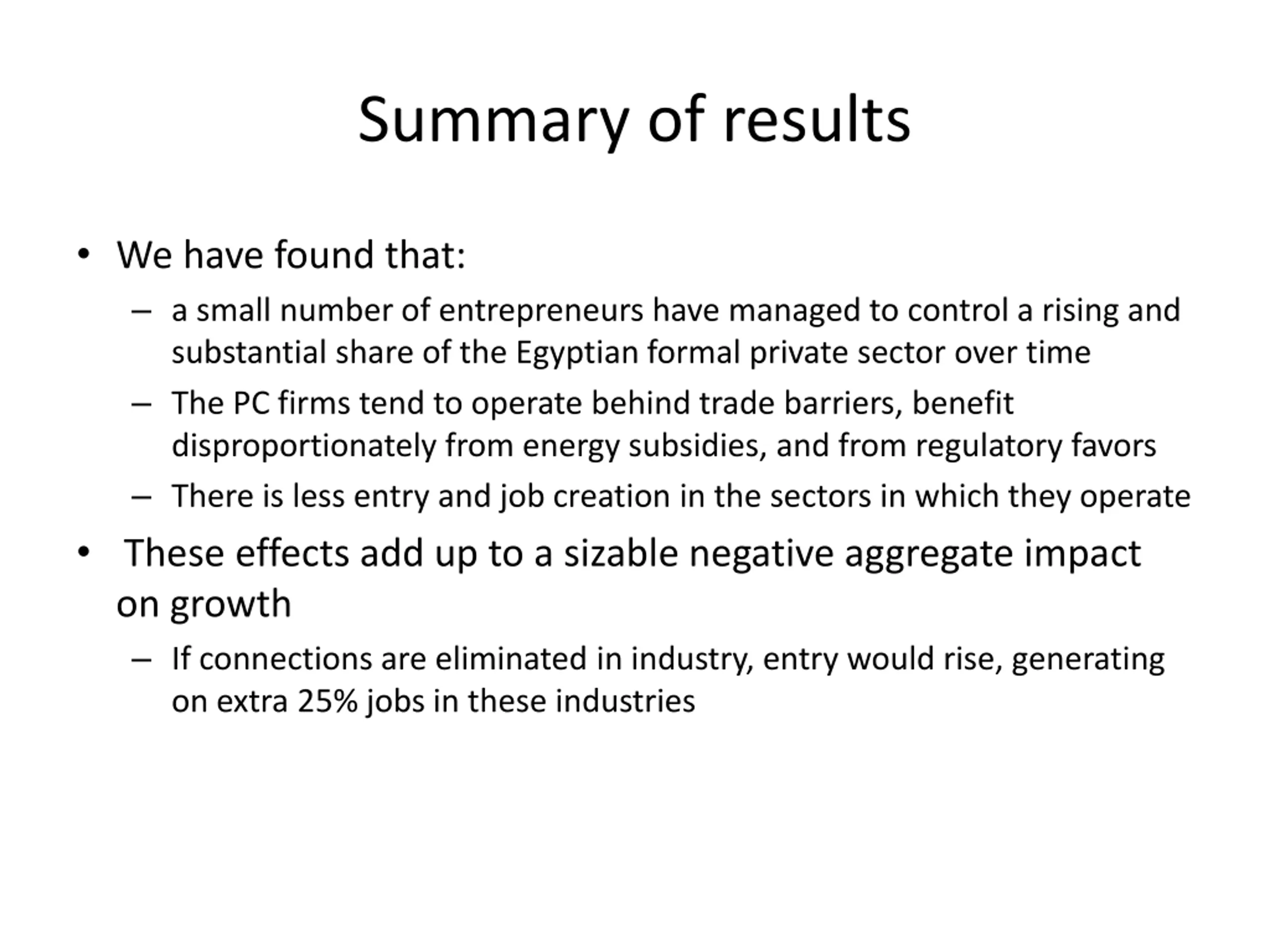 Summary of results We have found that: a small number of entrepreneurs have managed to control a rising and substantial share of the Egyptian formal private sector over time The PC firms tend to operate behind trade barriers, benefit disproportionately from energy subsidies, and from regulatory favors There is less entry and job creation in the sectors in which they operate These effects add up to a sizable negative aggregate impact on growth If connections are eliminated in industry, entry would rise, generating on extra 25% jobs in these industries