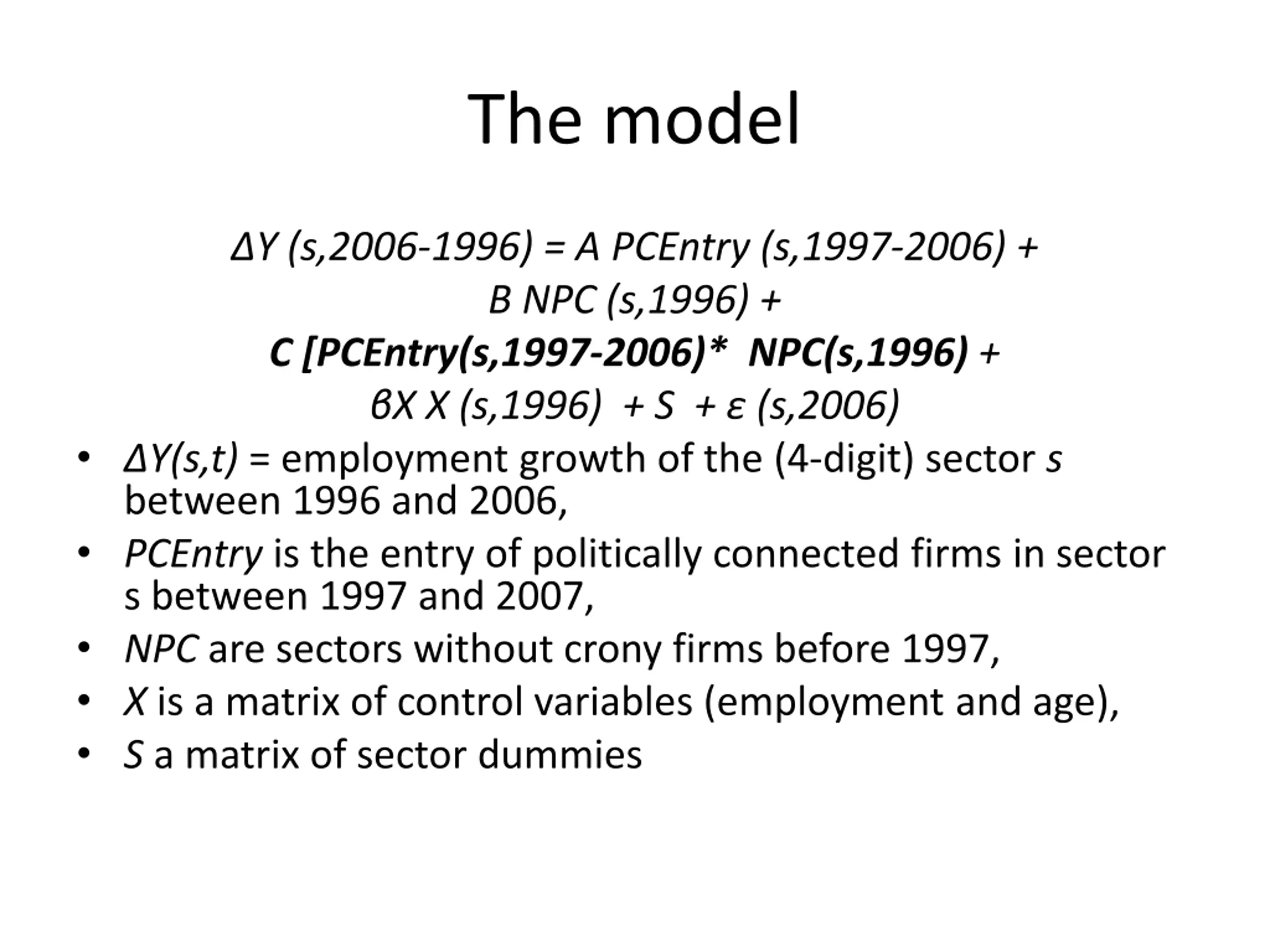 The model Y (s,2006-1996) = A PCEntry (s,1997-2006) + B NPC (s,1996) + C [PCEntry(s,1997-2006)* NPC(s,1996) + X X (s,1996) + S + (s,2006) Y(s,t) = employment growth of the (4-digit) sector s between 1996 and 2006, PCEntry is the entry of politically connected firms in sector s between 1997 and 2007, NPC are sectors without crony firms before 1997, X is a matrix of control variables (employment and age), S a matrix of sector dummies