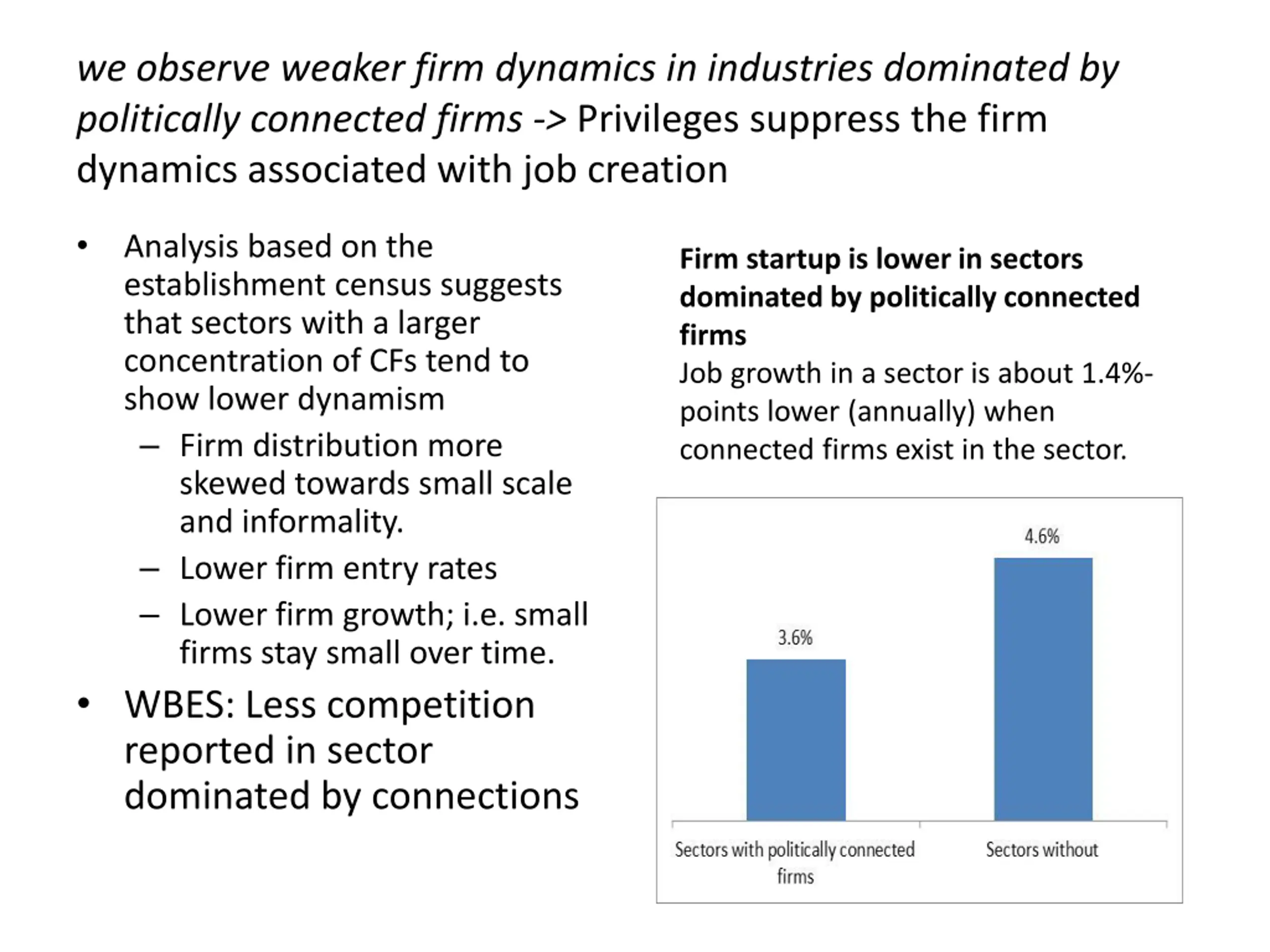 we observe weaker firm dynamics in industries dominated by politically connected firms -> Privileges suppress the firm dynamics associated with job creation Analysis based on the establishment census suggests that sectors with a larger concentration of CFs tend to show lower dynamism Firm distribution more skewed towards small scale and informality. Lower firm entry rates Lower firm growth; i.e. small firms stay small over time. WBES: Less competition reported in sector dominated by connections Firm startup is lower in sectors dominated by politically connected firms Job growth in a sector is about 1.4%- points lower (annually) when connected firms exist in the sector.