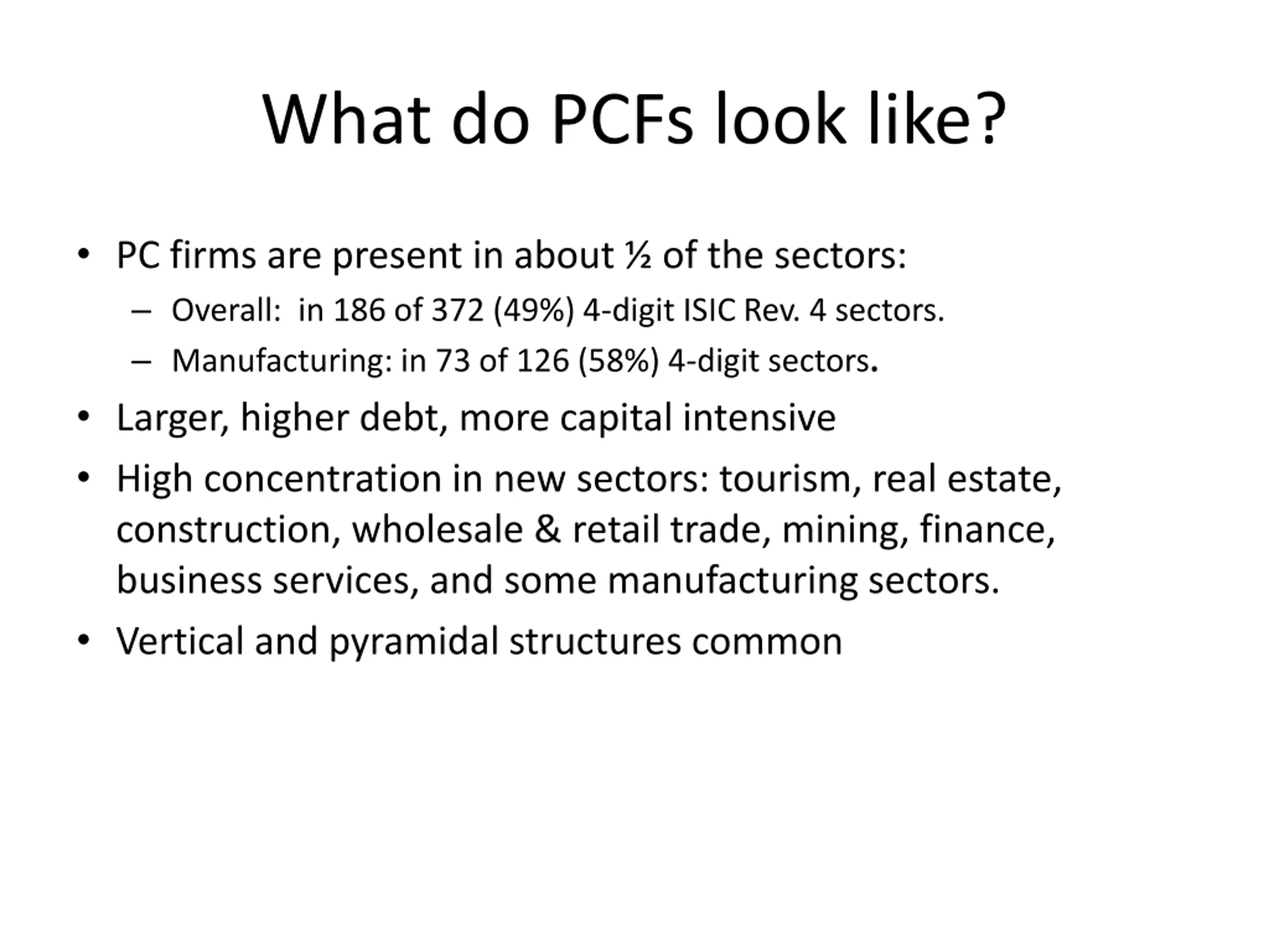 What do PCFs look like? PC firms are present in about of the sectors: Overall: in 186 of 372 (49%) 4-digit ISIC Rev. 4 sectors. Manufacturing: in 73 of 126 (58%) 4-digit sectors. Larger, higher debt, more capital intensive High concentration in new sectors: tourism, real estate, construction, wholesale & retail trade, mining, finance, business services, and some manufacturing sectors. Vertical and pyramidal structures common