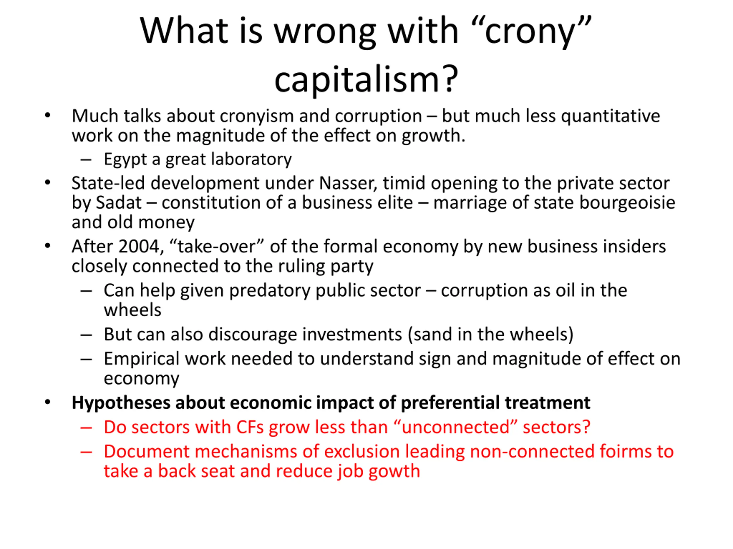 What is wrong with crony capitalism? Much talks about cronyism and corruption but much less quantitative work on the magnitude of the effect on growth. Egypt a great laboratory State-led development under Nasser, timid opening to the private sector by Sadat constitution of a business elite marriage of state bourgeoisie and old money After 2004, take-over of the formal economy by new business insiders closely connected to the ruling party Can help given predatory public sector corruption as oil in the wheels But can also discourage investments (sand in the wheels) Empirical work needed to understand sign and magnitude of effect on economy Hypotheses about economic impact of preferential treatment Do sectors with CFs grow less than unconnected sectors? Document mechanisms of exclusion leading non-connected foirms to take a back seat and reduce job gowth