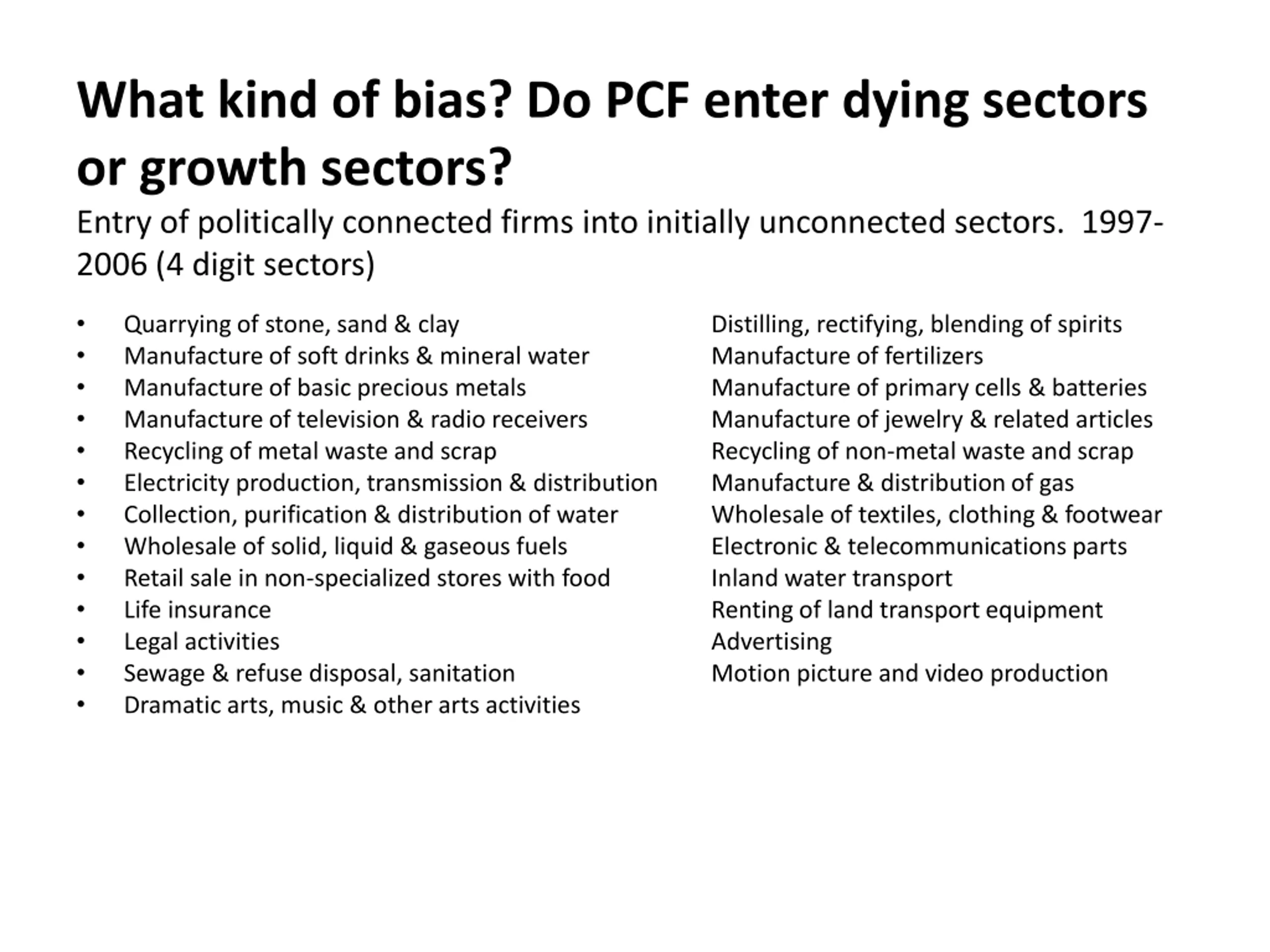 What kind of bias? Do PCF enter dying sectors or growth sectors? Entry of politically connected firms into initially unconnected sectors. 1997- 2006 (4 digit sectors) Quarrying of stone, sand & clay Manufacture of soft drinks & mineral water Manufacture of basic precious metals Manufacture of television & radio receivers Recycling of metal waste and scrap Electricity production, transmission & distribution Collection, purification & distribution of water Wholesale of solid, liquid & gaseous fuels Retail sale in non-specialized stores with food Life insurance Legal activities Sewage & refuse disposal, sanitation Dramatic arts, music & other arts activities Distilling, rectifying, blending of spirits Manufacture of fertilizers Manufacture of primary cells & batteries Manufacture of jewelry & related articles Recycling of non-metal waste and scrap Manufacture & distribution of gas Wholesale of textiles, clothing & footwear Electronic & telecommunications parts Inland water transport Renting of land transport equipment Advertising Motion picture and video production