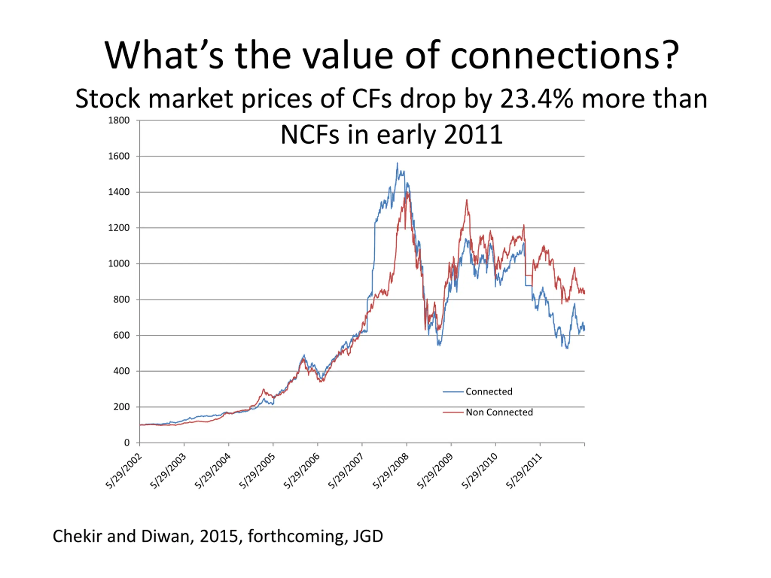 Whats the value of connections? Stock market prices of CFs drop by 23.4% more than NCFs in early 2011 1600 1800 1400 1200 1000 800 600 400 Connected 200 Non Connected 0 Chekir and Diwan, 2015, forthcoming, JGD