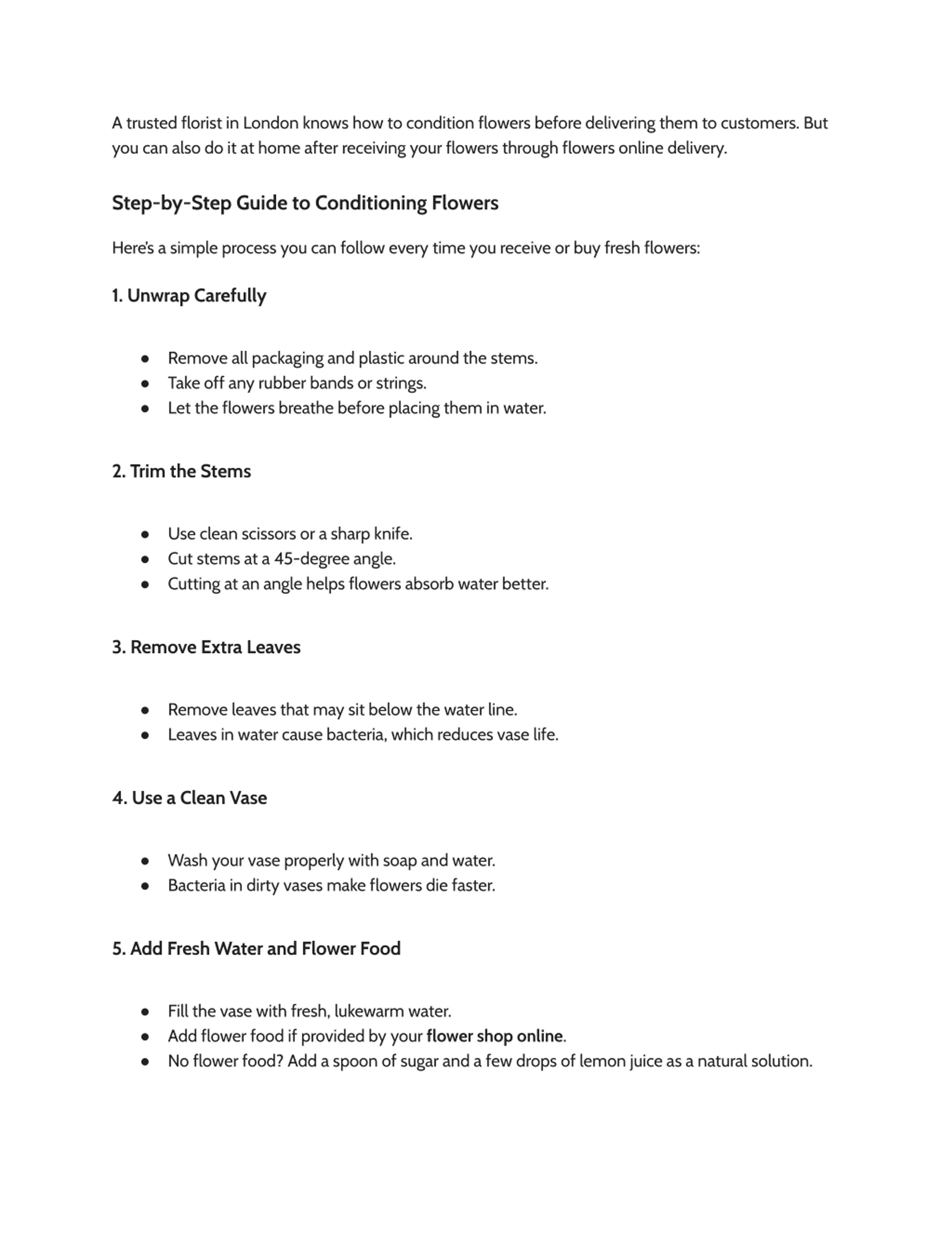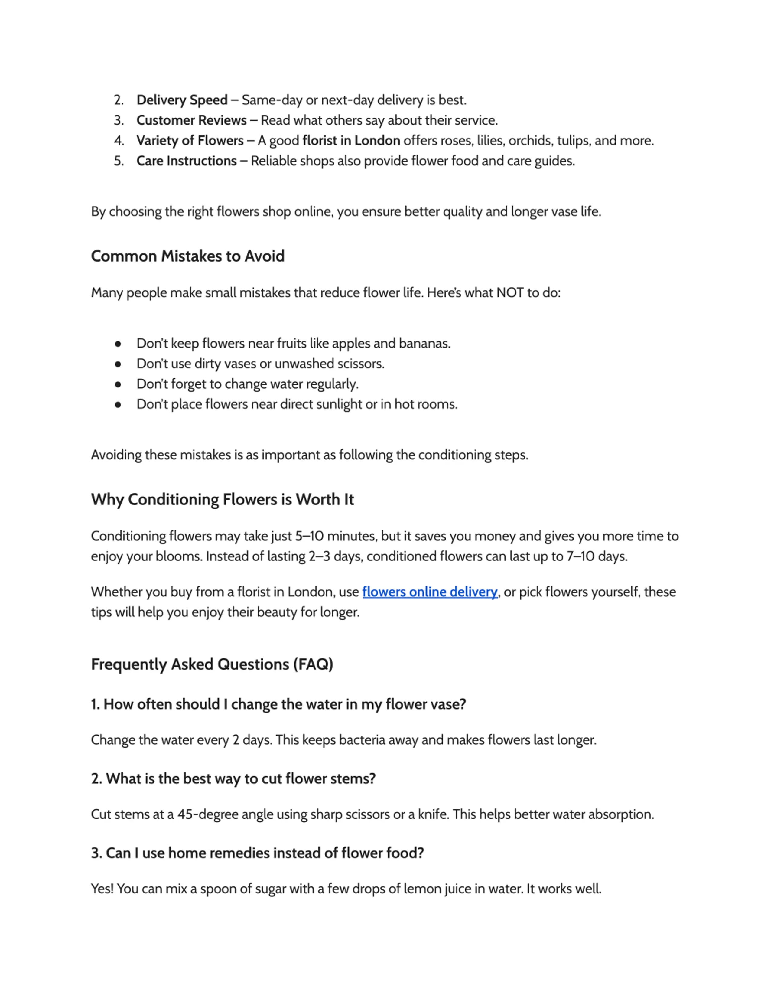 2. Delivery Speed Same-day or next-day delivery is best. 3. Customer Reviews Read what others say about their service. 4. Variety of Flowers A good florist in London offers roses, lilies, orchids, tulips, and more. 5. Care Instructions Reliable shops also provide flower food and care guides. By choosing the right flowers shop online, you ensure better quality and longer vase life. Common Mistakes to Avoid Many people make small mistakes that reduce flower life. Here s what NOT to do: Don t keep flowers near fruits like apples and bananas. Don t use dirty vases or unwashed scissors. Don t forget to change water regularly. Don t place flowers near direct sunlight or in hot rooms. Avoiding these mistakes is as important as following the conditioning steps. Why Conditioning Flowers is Worth It Conditioning flowers may take just 5 10 minutes, but it saves you money and gives you more time to enjoy your blooms. Instead of lasting 2 3 days, conditioned flowers can last up to 7 10 days. Whether you buy from a florist in London, use flowers online delivery, or pick flowers yourself, these tips will help you enjoy their beauty for longer. Frequently Asked Questions (FAQ) 1. How often should I change the water in my flower vase? Change the water every 2 days. This keeps bacteria away and makes flowers last longer. 2. What is the best way to cut flower stems? Cut stems at a 45-degree angle using sharp scissors or a knife. This helps better water absorption. 3. Can I use home remedies instead of flower food? Yes! You can mix a spoon of sugar with a few drops of lemon juice in water. It works well.