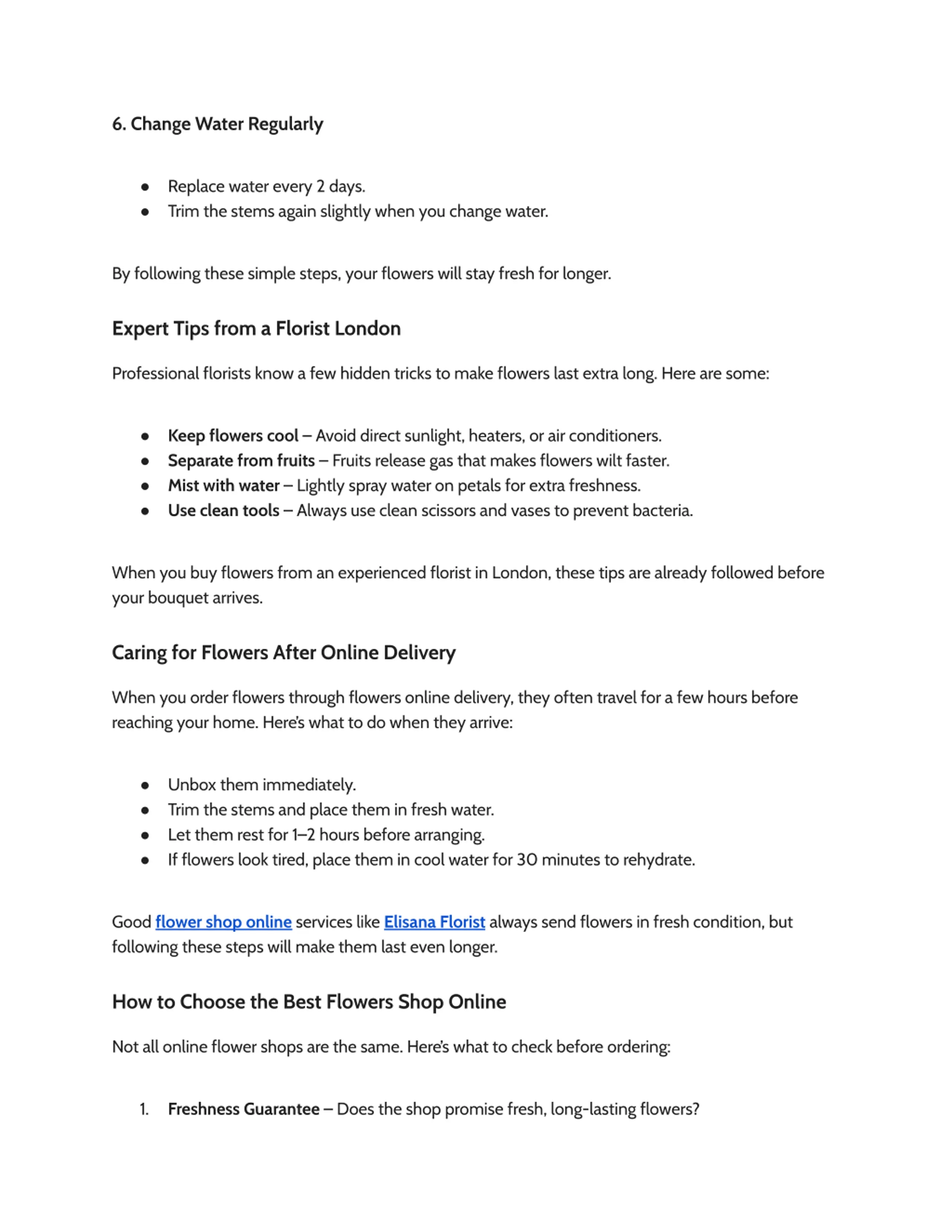 6. Change Water Regularly Replace water every 2 days. Trim the stems again slightly when you change water. By following these simple steps, your flowers will stay fresh for longer. Expert Tips from a Florist London Professional florists know a few hidden tricks to make flowers last extra long. Here are some: Keep flowers cool Avoid direct sunlight, heaters, or air conditioners. Separate from fruits Fruits release gas that makes flowers wilt faster. Mist with water Lightly spray water on petals for extra freshness. Use clean tools Always use clean scissors and vases to prevent bacteria. When you buy flowers from an experienced florist in London, these tips are already followed before your bouquet arrives. Caring for Flowers After Online Delivery When you order flowers through flowers online delivery, they often travel for a few hours before reaching your home. Here s what to do when they arrive: Unbox them immediately. Trim the stems and place them in fresh water. Let them rest for 1 2 hours before arranging. If flowers look tired, place them in cool water for 30 minutes to rehydrate. Good flower shop online services like Elisana Florist always send flowers in fresh condition, but following these steps will make them last even longer. How to Choose the Best Flowers Shop Online Not all online flower shops are the same. Here s what to check before ordering: 1. Freshness Guarantee Does the shop promise fresh, long-lasting flowers?