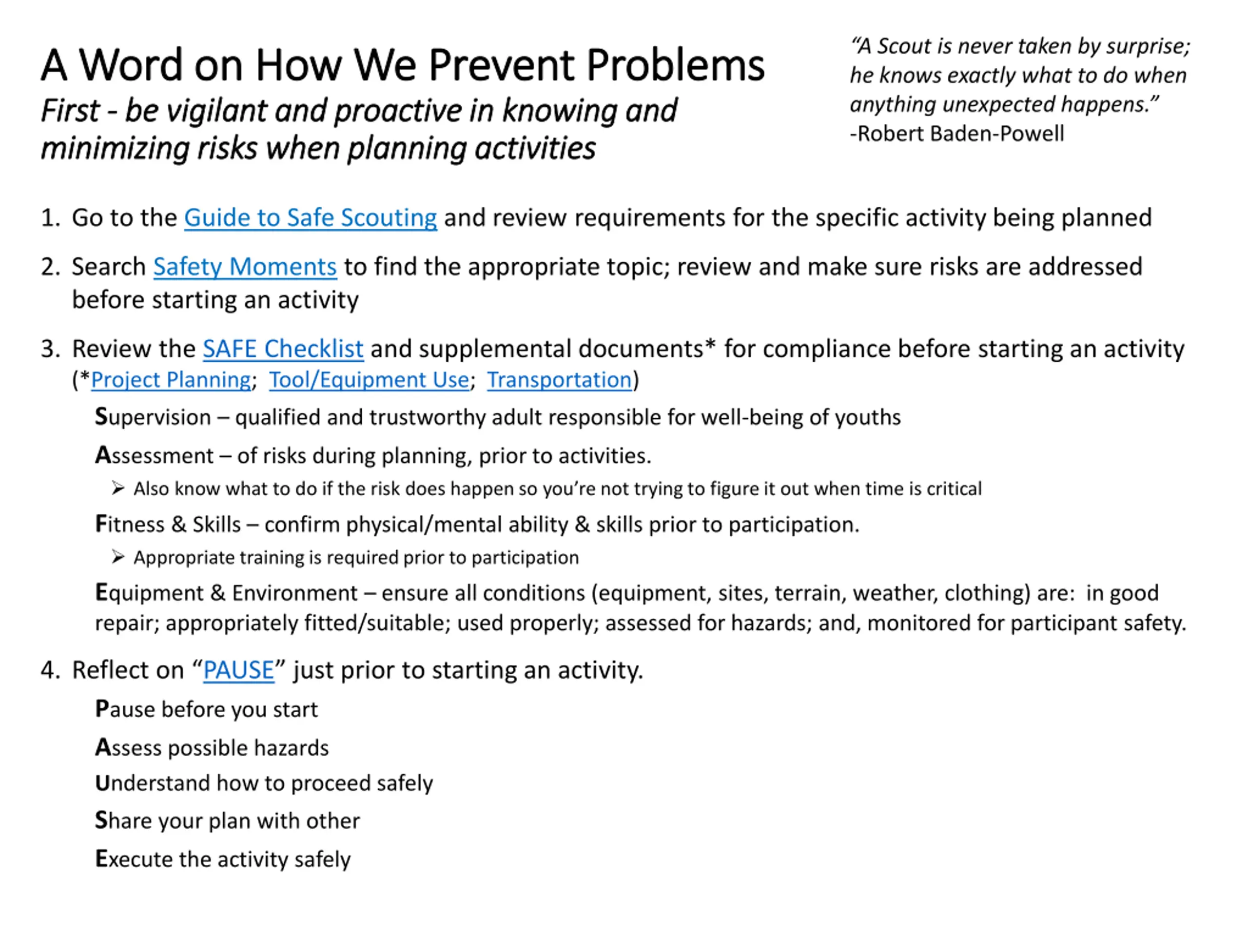 A Scout is never taken by surprise; he knows exactly what to do when anything unexpected happens. -Robert Baden-Powell A Word on How We Prevent Problems A Word on How We Prevent Problems First First - - be vigilant and proactive in knowing and be vigilant and proactive in knowing and minimizing risks when planning activities minimizing risks when planning activities 1. Go to the Guide to Safe Scouting and review requirements for the specific activity being planned 2. Search Safety Moments to find the appropriate topic; review and make sure risks are addressed before starting an activity 3. Review the SAFE Checklist and supplemental documents* for compliance before starting an activity (*Project Planning; Tool/Equipment Use; Transportation) Supervision qualified and trustworthy adult responsible for well-being of youths Assessment of risks during planning, prior to activities. Also know what to do if the risk does happen so you re not trying to figure it out when time is critical Fitness & Skills confirm physical/mental ability & skills prior to participation. Appropriate training is required prior to participation Equipment & Environment ensure all conditions (equipment, sites, terrain, weather, clothing) are: in good repair; appropriately fitted/suitable; used properly; assessed for hazards; and, monitored for participant safety. 4. Reflect on PAUSE just prior to starting an activity. Pause before you start Assess possible hazards Understand how to proceed safely Share your plan with other Execute the activity safely