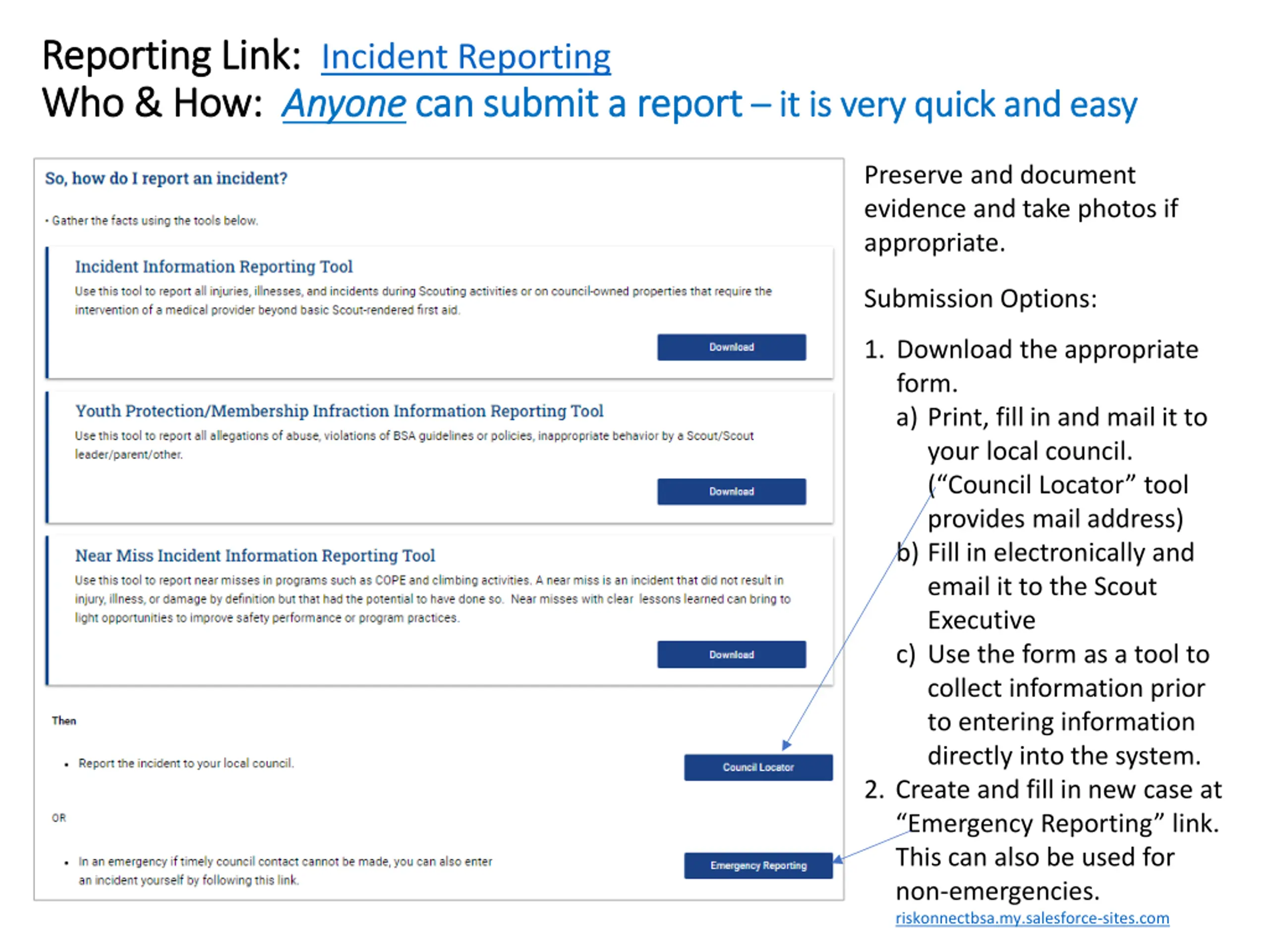 Reporting Link: Reporting Link: Incident Reporting Who & How: Who & How: Anyone Anyone can submit a report can submit a report it is very quick and easy it is very quick and easy Preserve and document evidence and take photos if appropriate. Submission Options: 1. Download the appropriate form. a) Print, fill in and mail it to your local council. ( Council Locator tool provides mail address) b) Fill in electronically and email it to the Scout Executive c) Use the form as a tool to collect information prior to entering information directly into the system. 2. Create and fill in new case at Emergency Reporting link. This can also be used for non-emergencies. riskonnectbsa.my.salesforce-sites.com