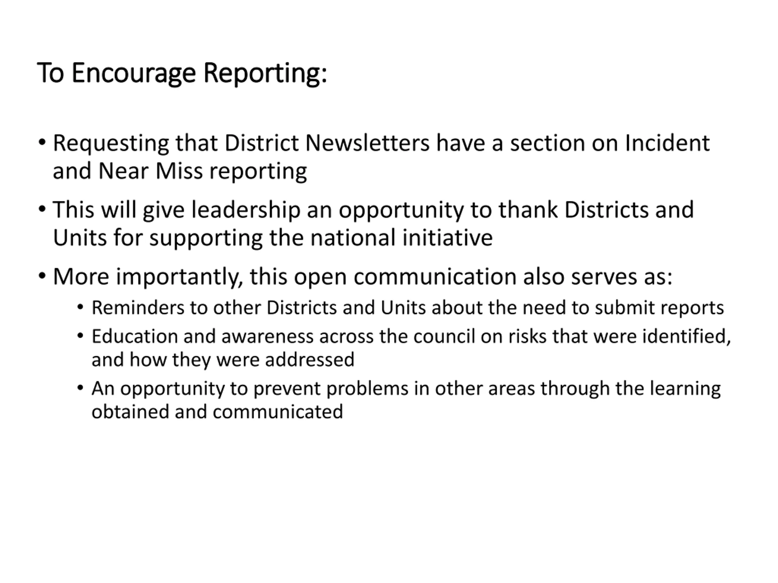To Encourage Reporting: To Encourage Reporting: Requesting that District Newsletters have a section on Incident and Near Miss reporting This will give leadership an opportunity to thank Districts and Units for supporting the national initiative More importantly, this open communication also serves as: Reminders to other Districts and Units about the need to submit reports Education and awareness across the council on risks that were identified, and how they were addressed An opportunity to prevent problems in other areas through the learning obtained and communicated