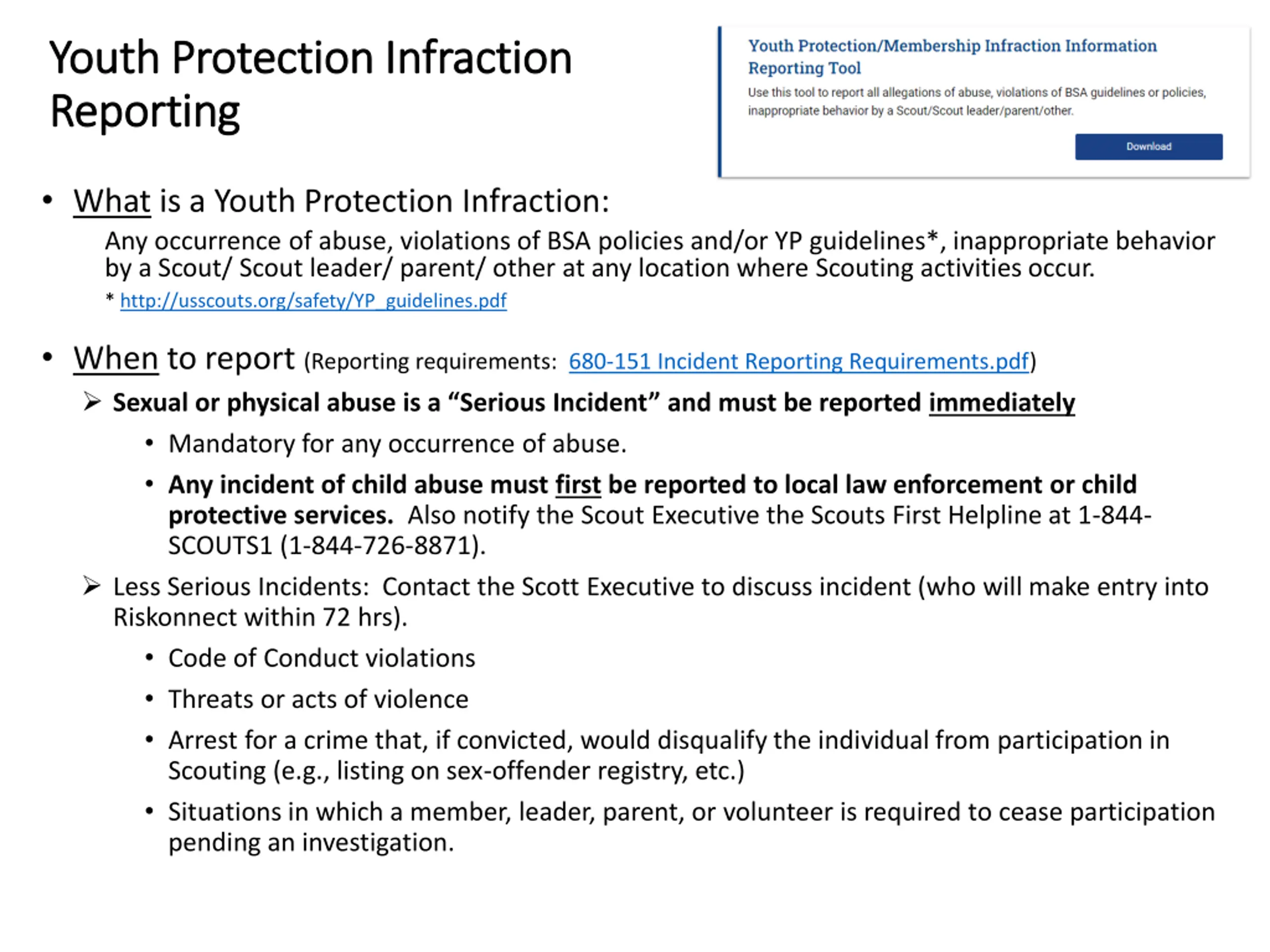 Youth Protection Infraction Youth Protection Infraction Reporting Reporting What is a Youth Protection Infraction: Any occurrence of abuse, violations of BSA policies and/or YP guidelines*, inappropriate behavior by a Scout/ Scout leader/ parent/ other at any location where Scouting activities occur. * http://usscouts.org/safety/YP_guidelines.pdf When to report (Reporting requirements: 680-151 Incident Reporting Requirements.pdf) Sexual or physical abuse is a Serious Incident and must be reported immediately Mandatory for any occurrence of abuse. Any incident of child abuse must first be reported to local law enforcement or child protective services. Also notify the Scout Executive the Scouts First Helpline at 1-844- SCOUTS1 (1-844-726-8871). Less Serious Incidents: Contact the Scott Executive to discuss incident (who will make entry into Riskonnect within 72 hrs). Code of Conduct violations Threats or acts of violence Arrest for a crime that, if convicted, would disqualify the individual from participation in Scouting (e.g., listing on sex-offender registry, etc.) Situations in which a member, leader, parent, or volunteer is required to cease participation pending an investigation.