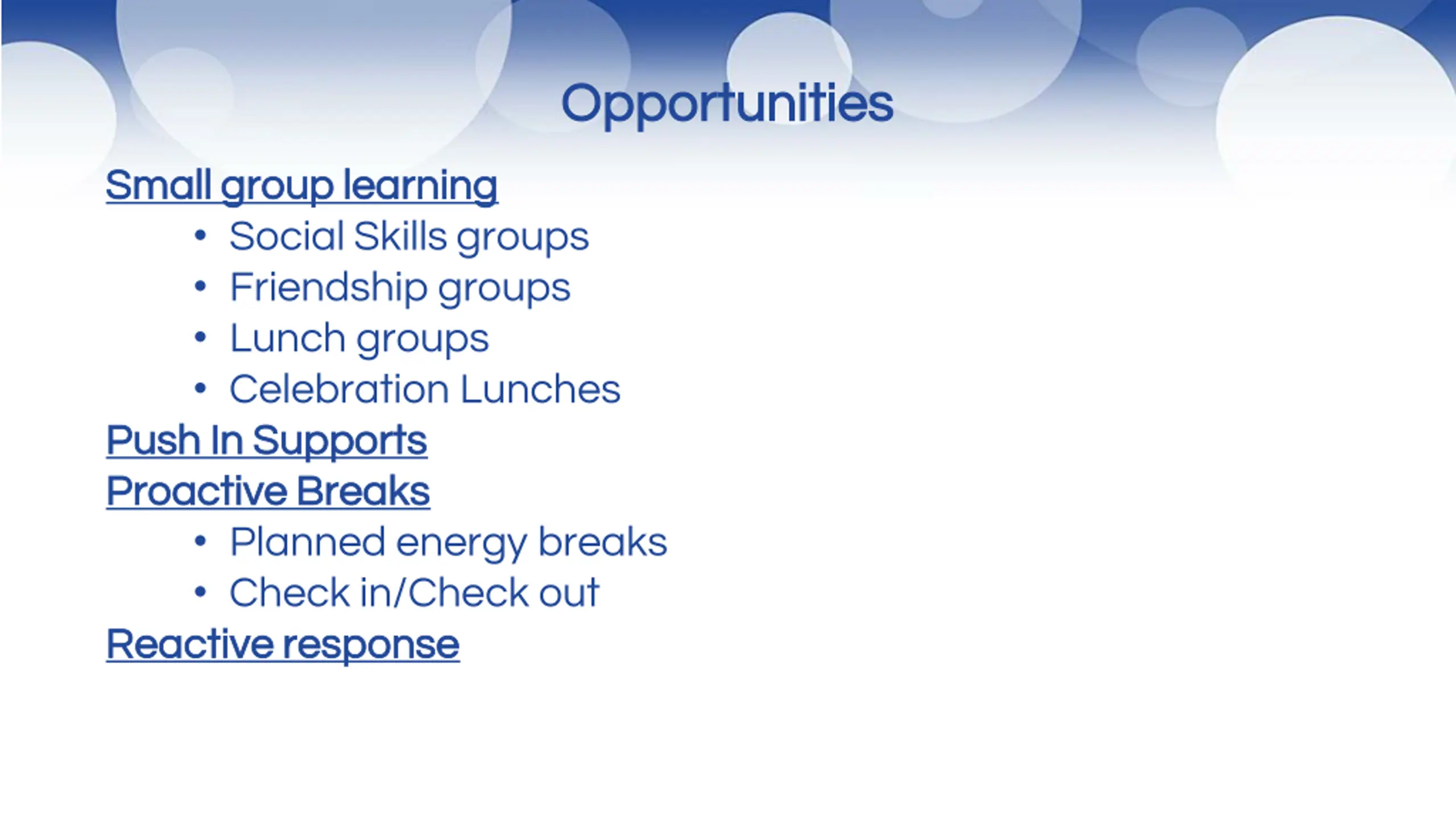 Opportunities Opportunities Small group learning Small group learning Social Skills groups Friendship groups Lunch groups Celebration Lunches Push In Supports Push In Supports Proactive Breaks Proactive Breaks Planned energy breaks Check in/Check out Reactive response Reactive response