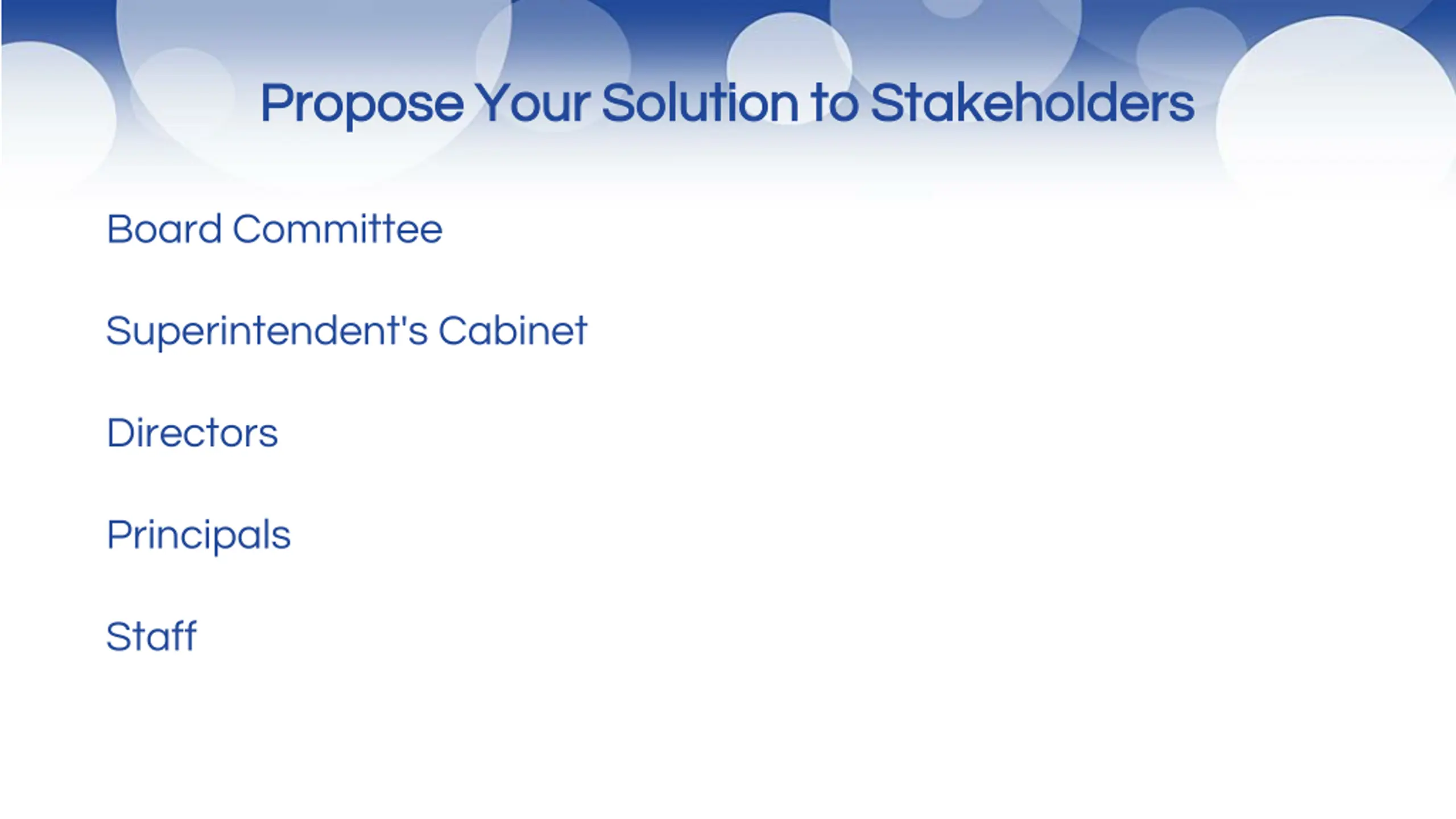 Propose Your Solution to Stakeholders Propose Your Solution to Stakeholders Board Committee Superintendent's Cabinet Directors Principals Staff