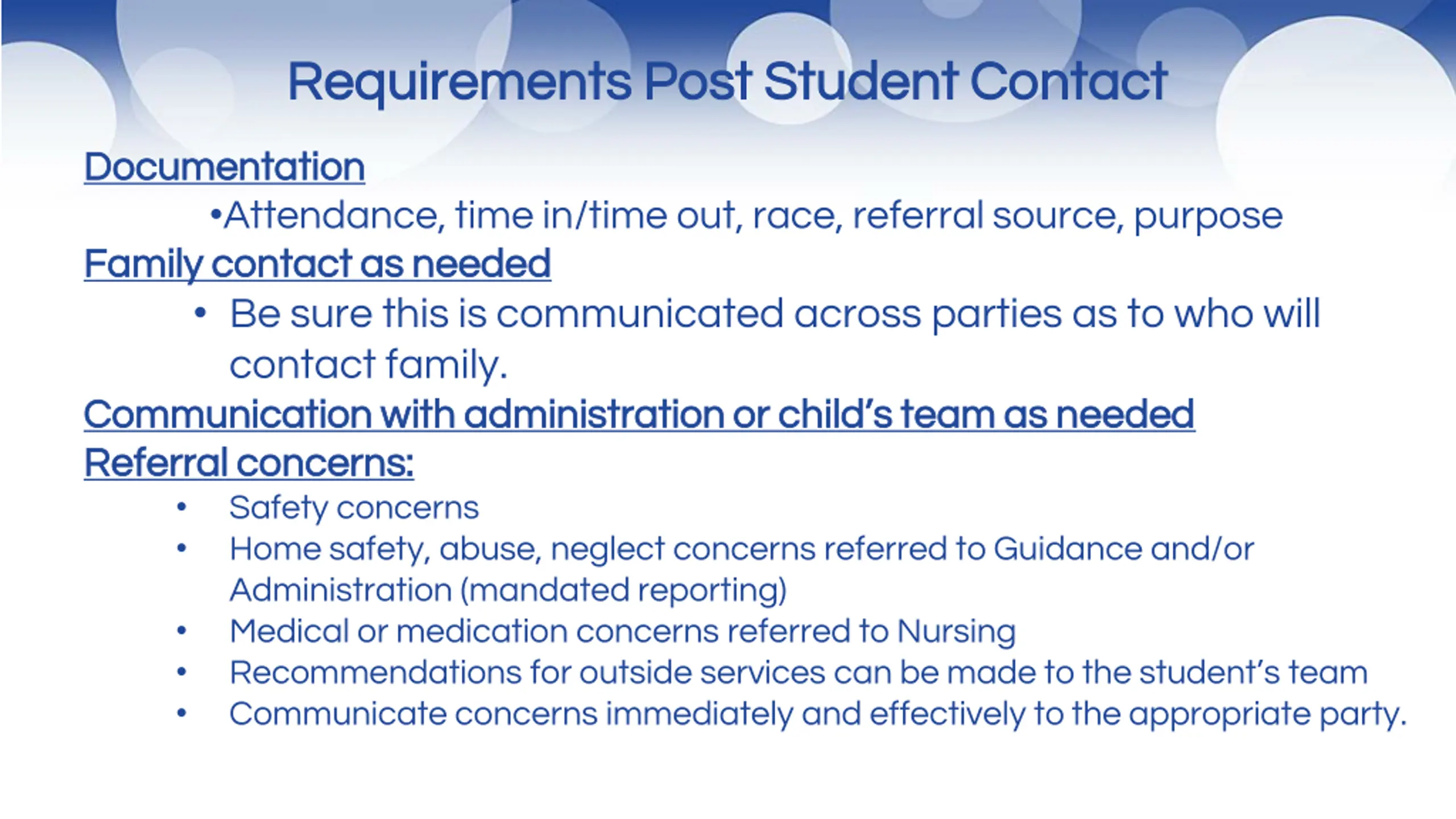 Requirements Post Student Contact Requirements Post Student Contact Documentation Documentation Attendance, time in/time out, race, referral source, purpose Family contact as needed Family contact as needed Be sure this is communicated across parties as to who will contact family. Communication with administration or child s team as needed Communication with administration or child s team as needed Referral concerns: Referral concerns: Safety concerns Home safety, abuse, neglect concerns referred to Guidance and/or Administration (mandated reporting) Medical or medication concerns referred to Nursing Recommendations for outside services can be made to the student s team Communicate concerns immediately and effectively to the appropriate party.