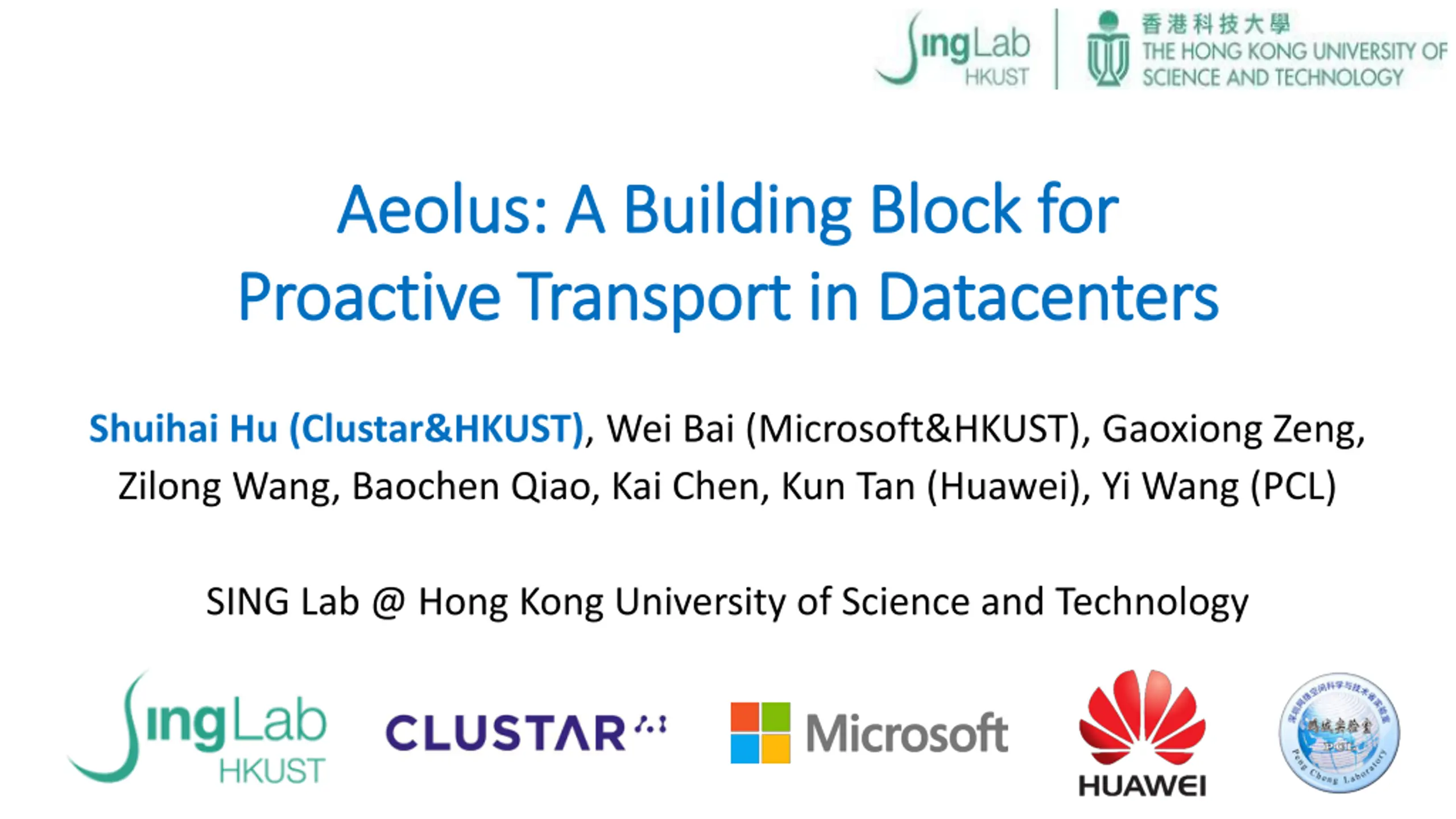 Aeolus: A Building Block for Aeolus: A Building Block for Proactive Transport in Datacenters Proactive Transport in Datacenters Shuihai Hu (Clustar&HKUST), Wei Bai (Microsoft&HKUST), Gaoxiong Zeng, Zilong Wang, Baochen Qiao, Kai Chen, Kun Tan (Huawei), Yi Wang (PCL) SING Lab @ Hong Kong University of Science and Technology 1
