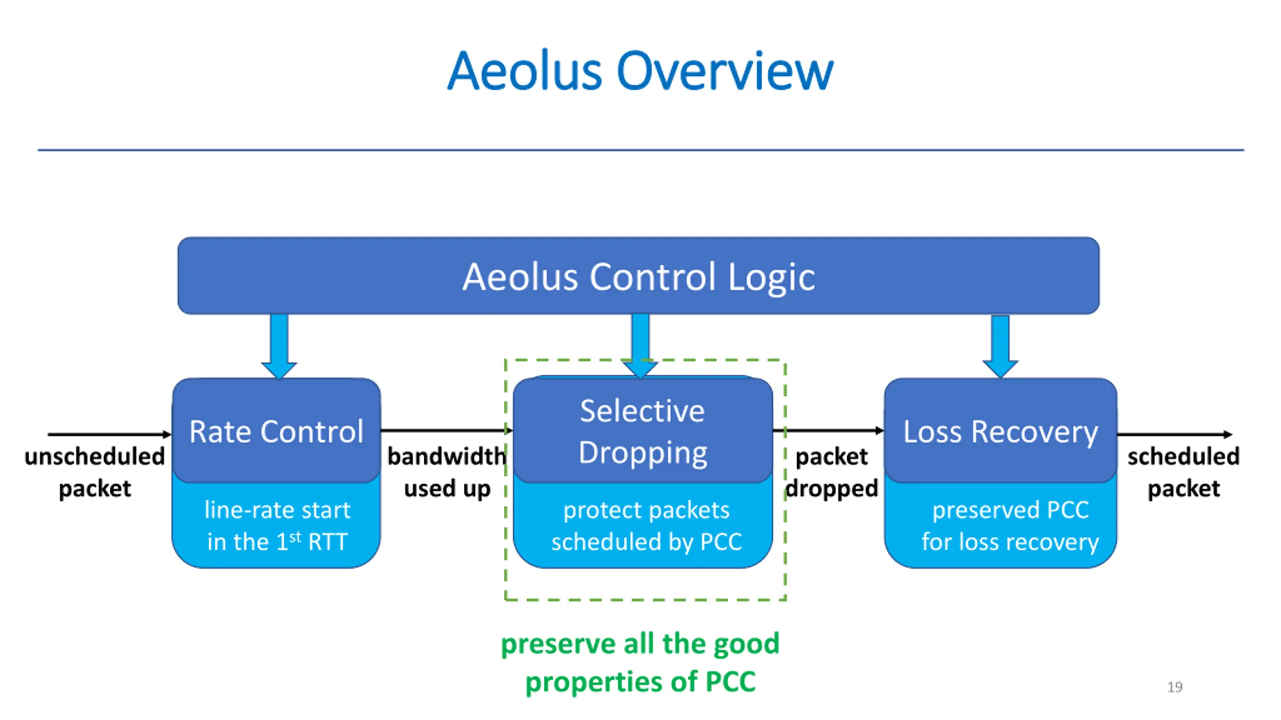 Aeolus Overview Aeolus Overview Aeolus Control Logic Selective Dropping Rate Control Loss Recovery unscheduled packet bandwidth used up packet dropped scheduled packet line-rate start in the 1st RTT protect packets scheduled by PCC preserved PCC for loss recovery maximize the chance to utilize spare bandwidth 18