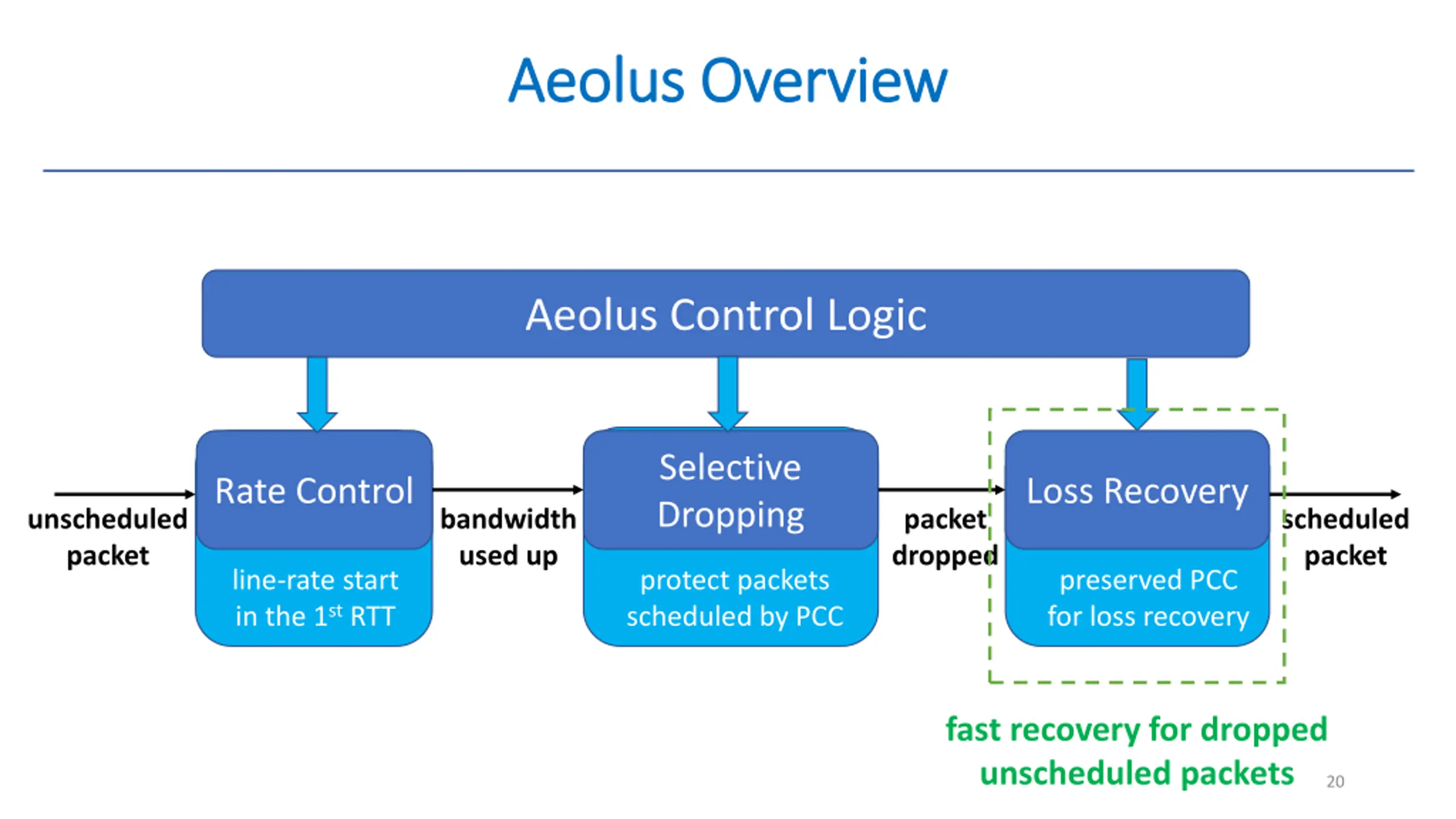 Aeolus Overview Aeolus Overview Aeolus Control Logic Selective Dropping Rate Control Loss Recovery unscheduled packet bandwidth used up packet dropped scheduled packet line-rate start in the 1st RTT protect packets scheduled by PCC preserved PCC for loss recovery preserve all the good properties of PCC 19
