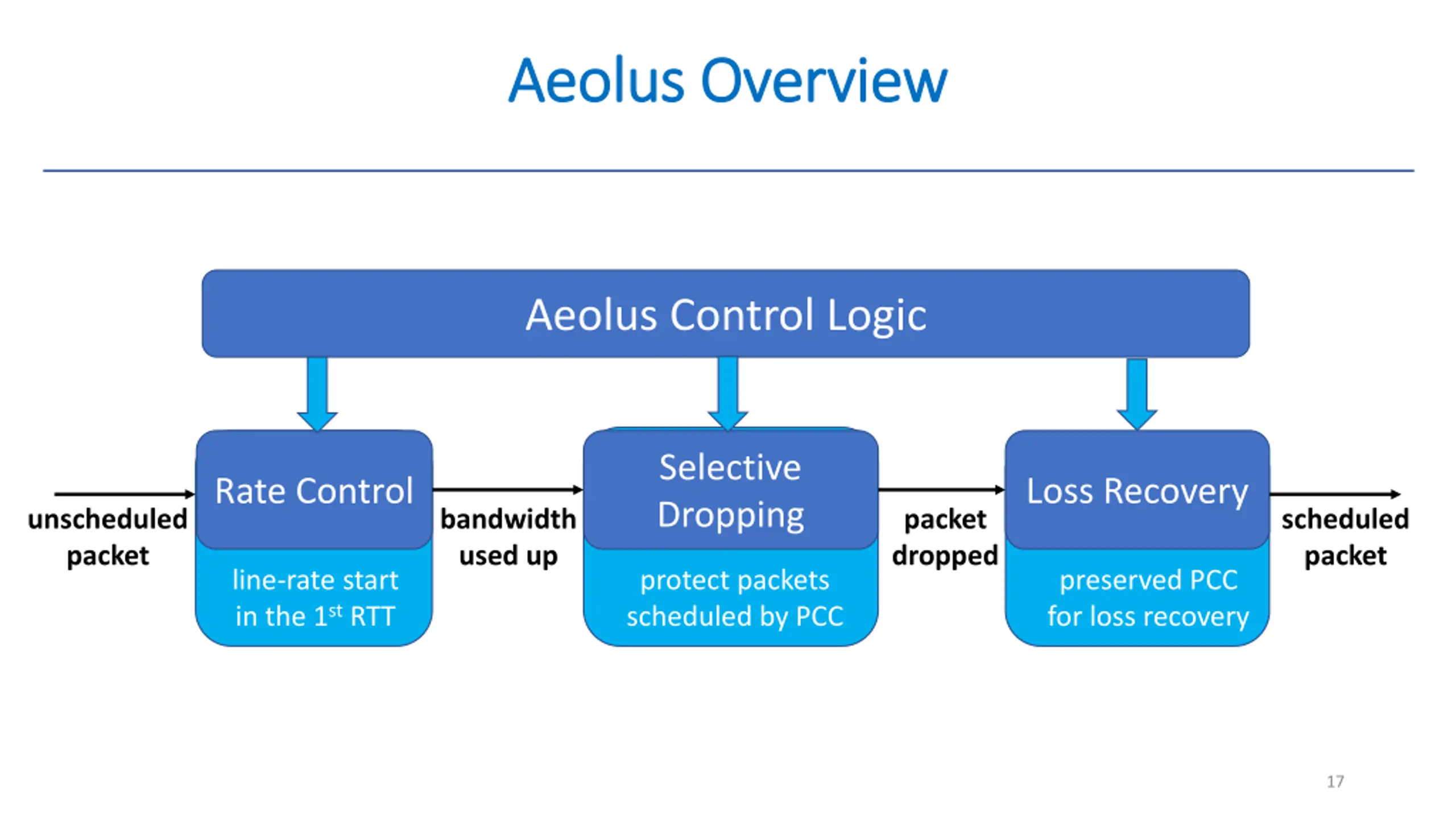 Aeolus Overview Aeolus Overview Aeolus Control Logic Selective Dropping Rate Control Loss Recovery unscheduled packet bandwidth used up packet dropped scheduled packet line-rate start in the 1st RTT protect packets scheduled by PCC preserved PCC for loss recovery 17