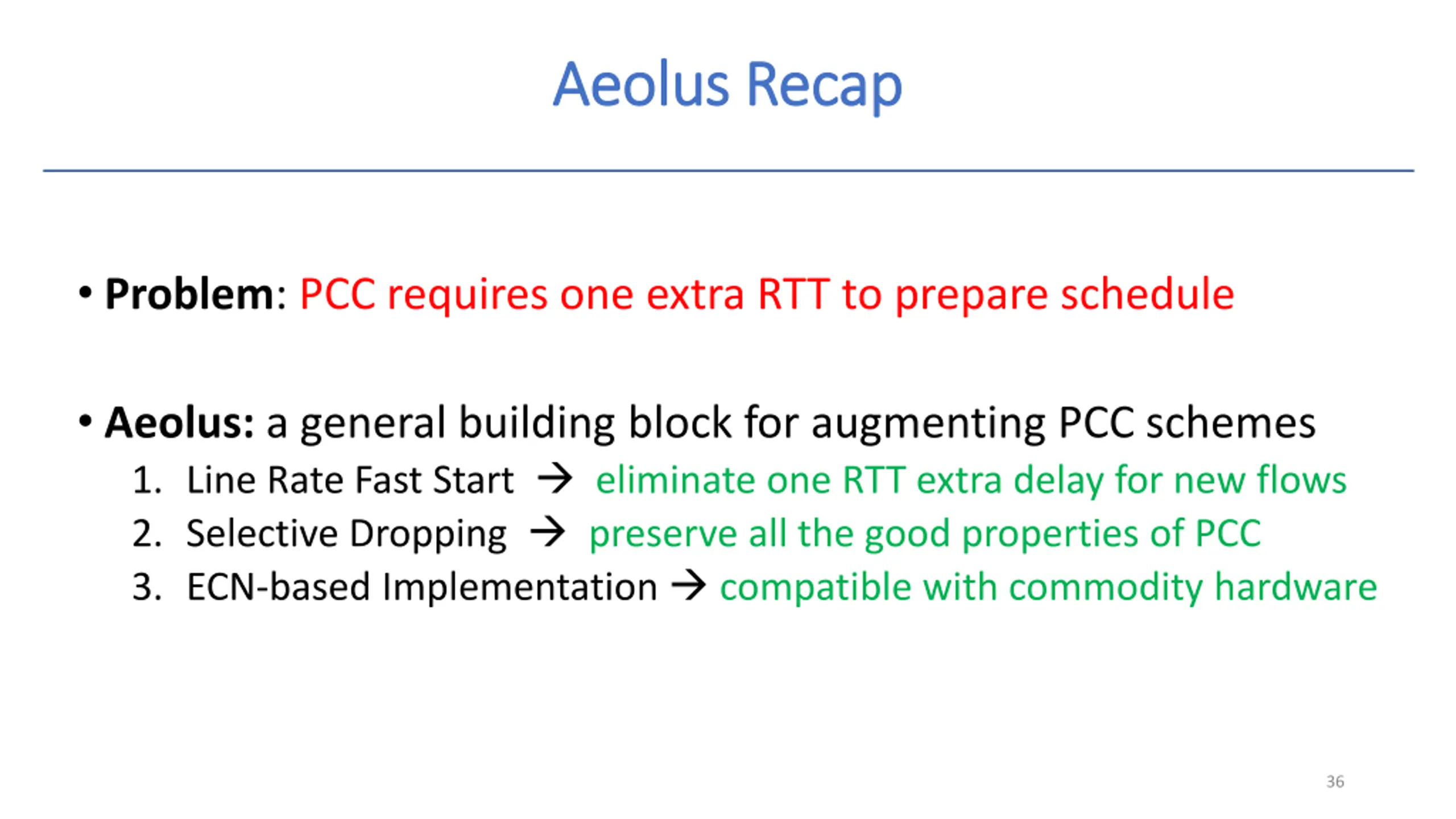 Aeolus Recap Aeolus Recap Problem: PCC requires one extra RTT to prepare schedule Aeolus: a general building block for augmenting PCC schemes 1. Line Rate Fast Start eliminate one RTT extra delay for new flows 2. Selective Dropping preserve all the good properties of PCC 3. ECN-based Implementation compatible with commodity hardware 36