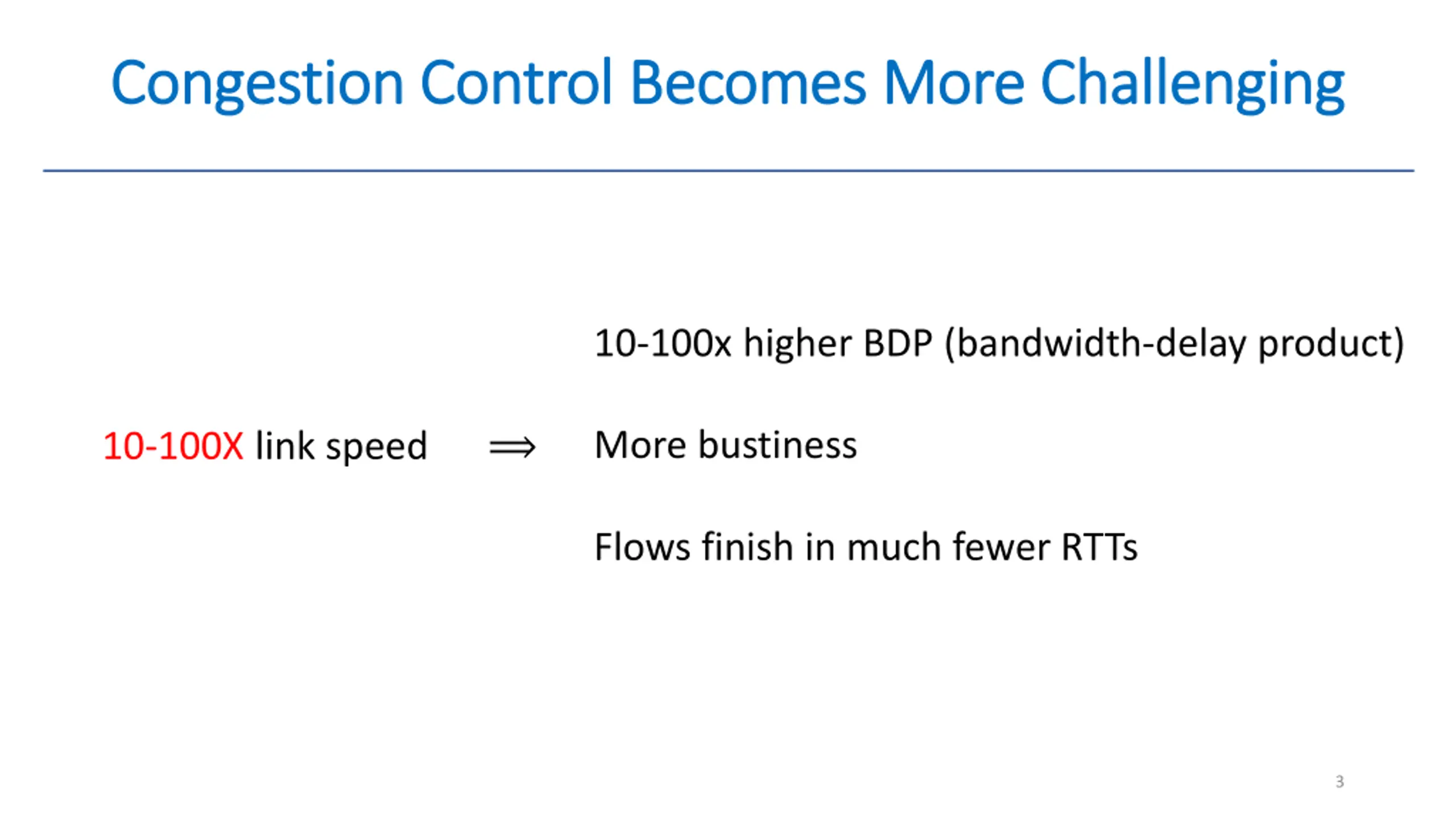 Congestion Control Becomes More Challenging Congestion Control Becomes More Challenging 10-100x higher BDP (bandwidth-delay product) More bustiness 10-100X link speed Flows finish in much fewer RTTs 3
