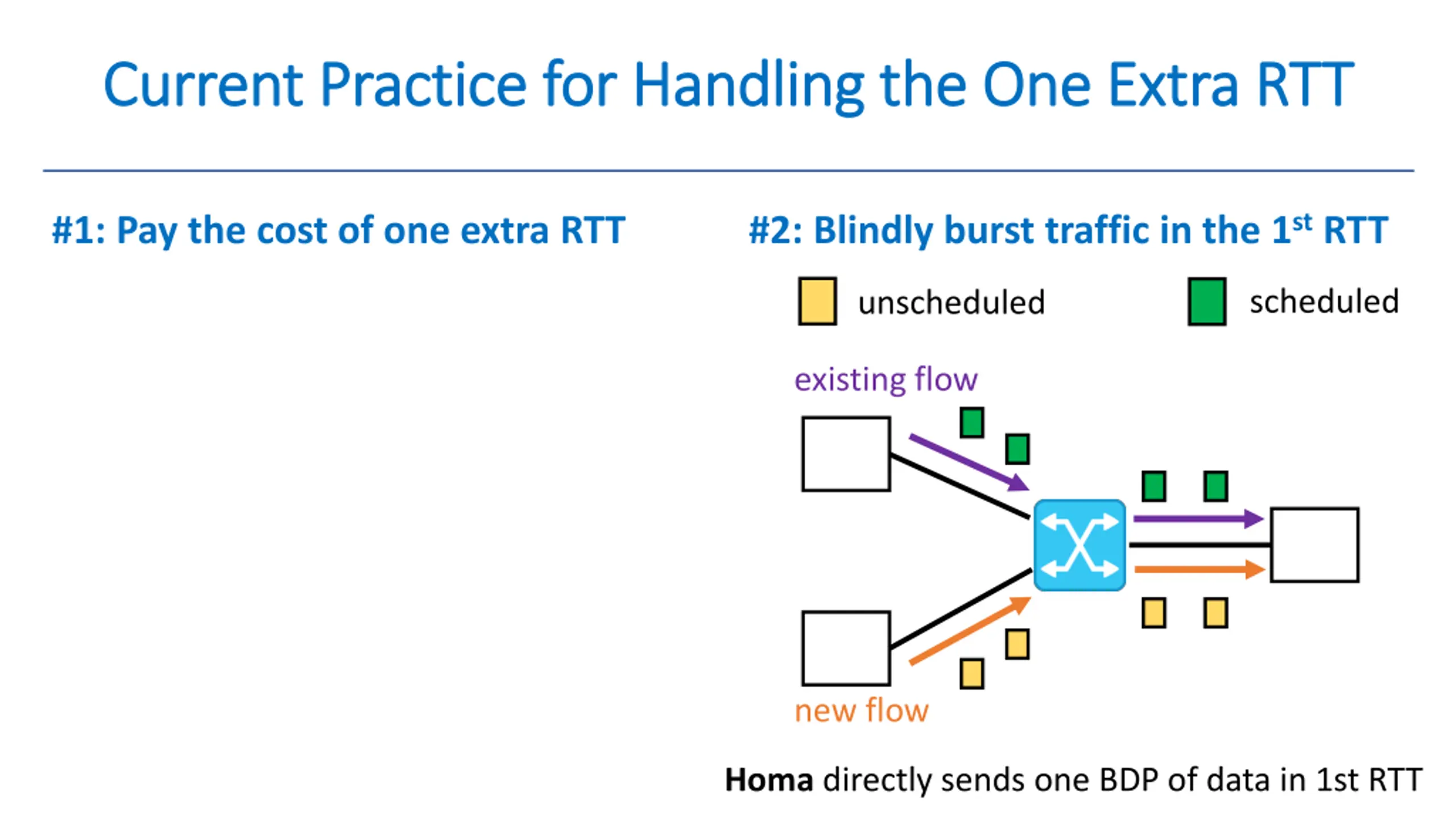 Current Practice for Handling the One Extra RTT Current Practice for Handling the One Extra RTT #2: Blindly burst traffic in the 1st RTT #1: Pay the cost of one extra RTT scheduled unscheduled existing flow new flow Homa directly sends one BDP of data in 1st RTT