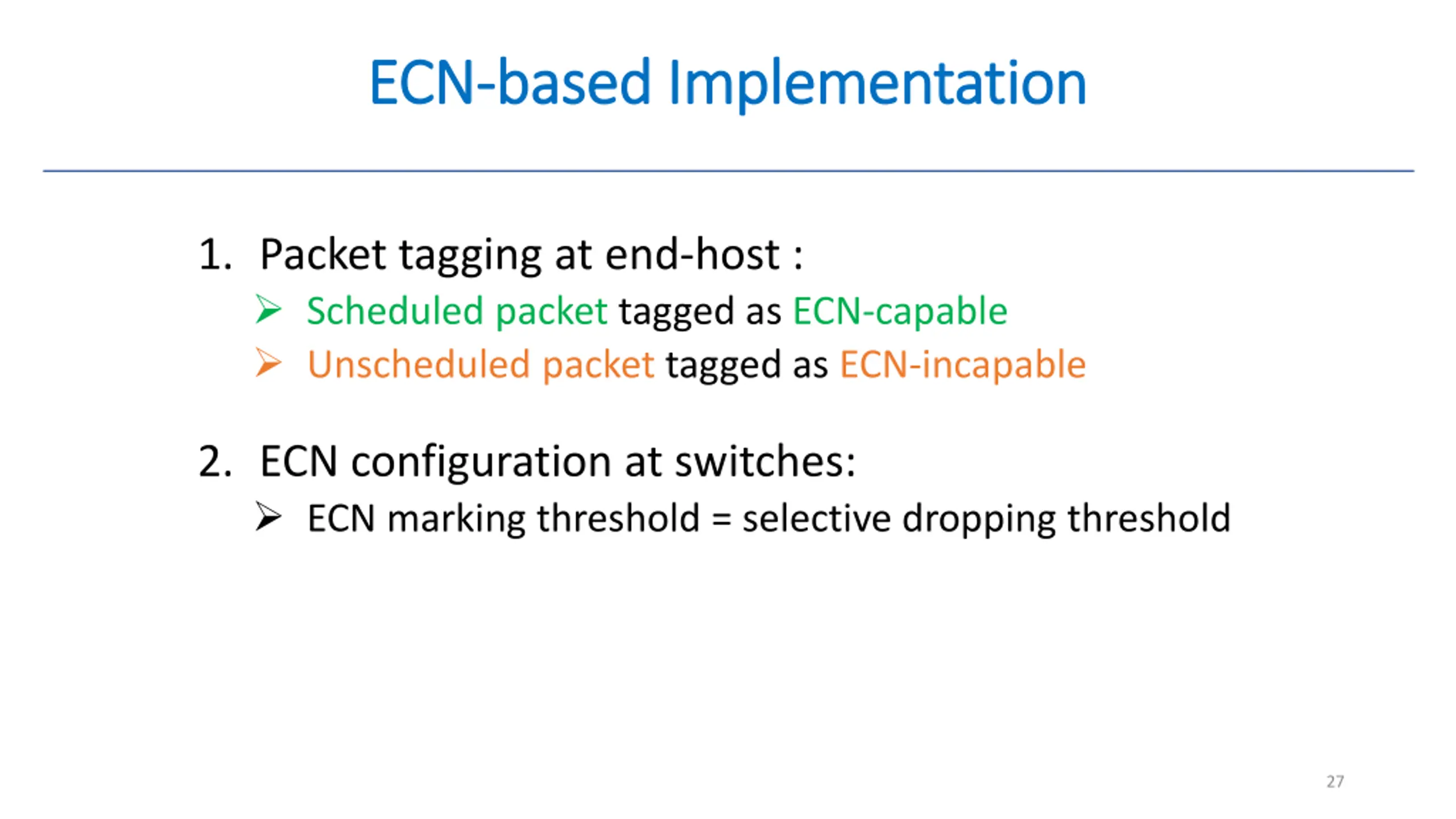 ECN ECN- -based Implementation based Implementation 1. Packet tagging at end-host : Scheduled packet tagged as ECN-capable Unscheduled packet tagged as ECN-incapable 2. ECN configuration at switches: ECN marking threshold = selective dropping threshold 27
