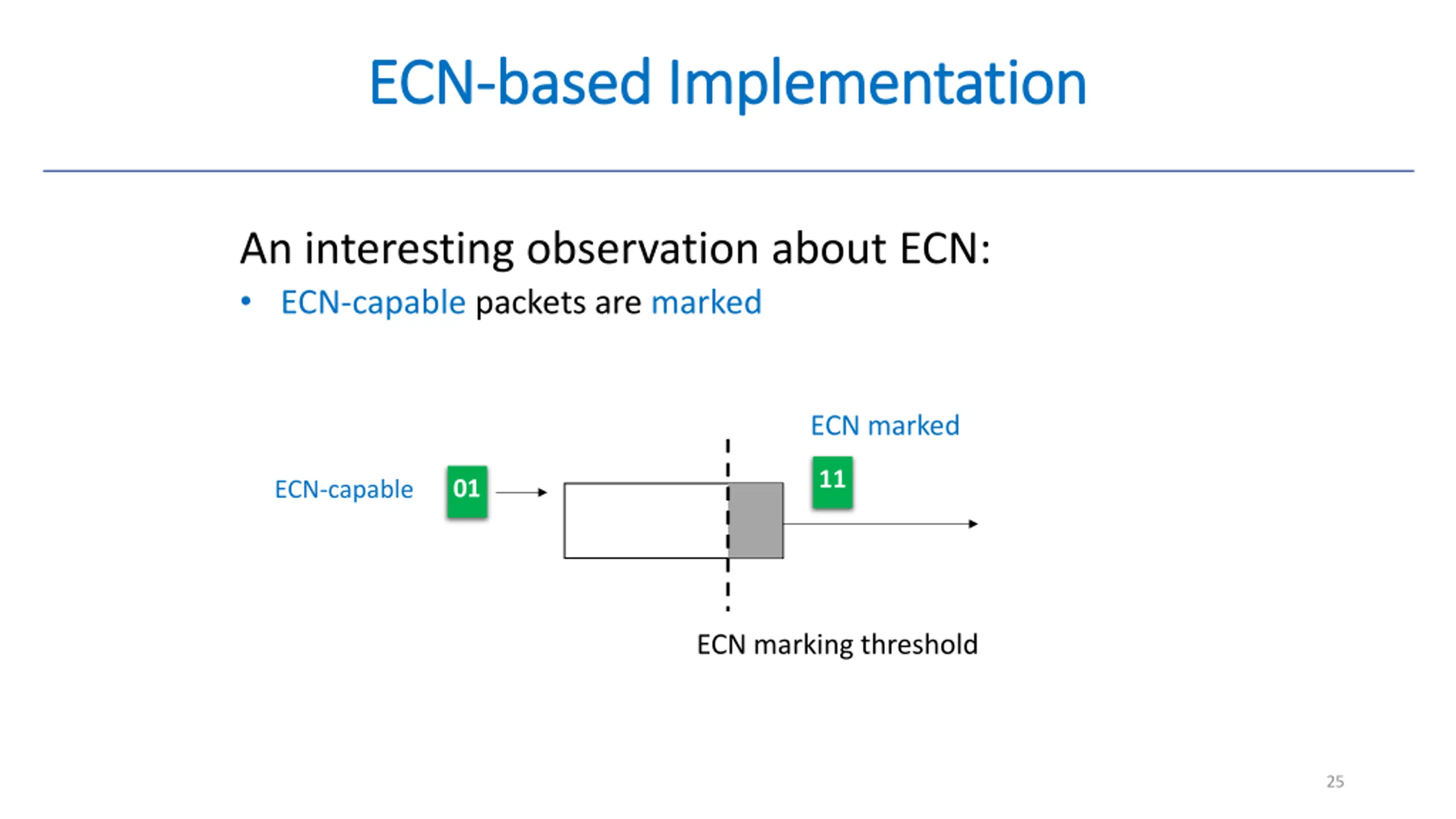 How to Implement? How to Implement? We leverage ECN (Explicit Congestion Notification), a built-in function of commodity switches, for implementation What is ECN? a switch mechanism which performs congestion notification via marking ECT and CE field in the IP header ECT CE Names for the ECN bits 0 0 Not-ECT (Not ECN Capable Transport) 0 1 ECT(1) (ECN Capable Transport (1)) 1 0 ECT(0) (ECN Capable Transport(0)) 1 1 CE (Congestion Experienced) 24