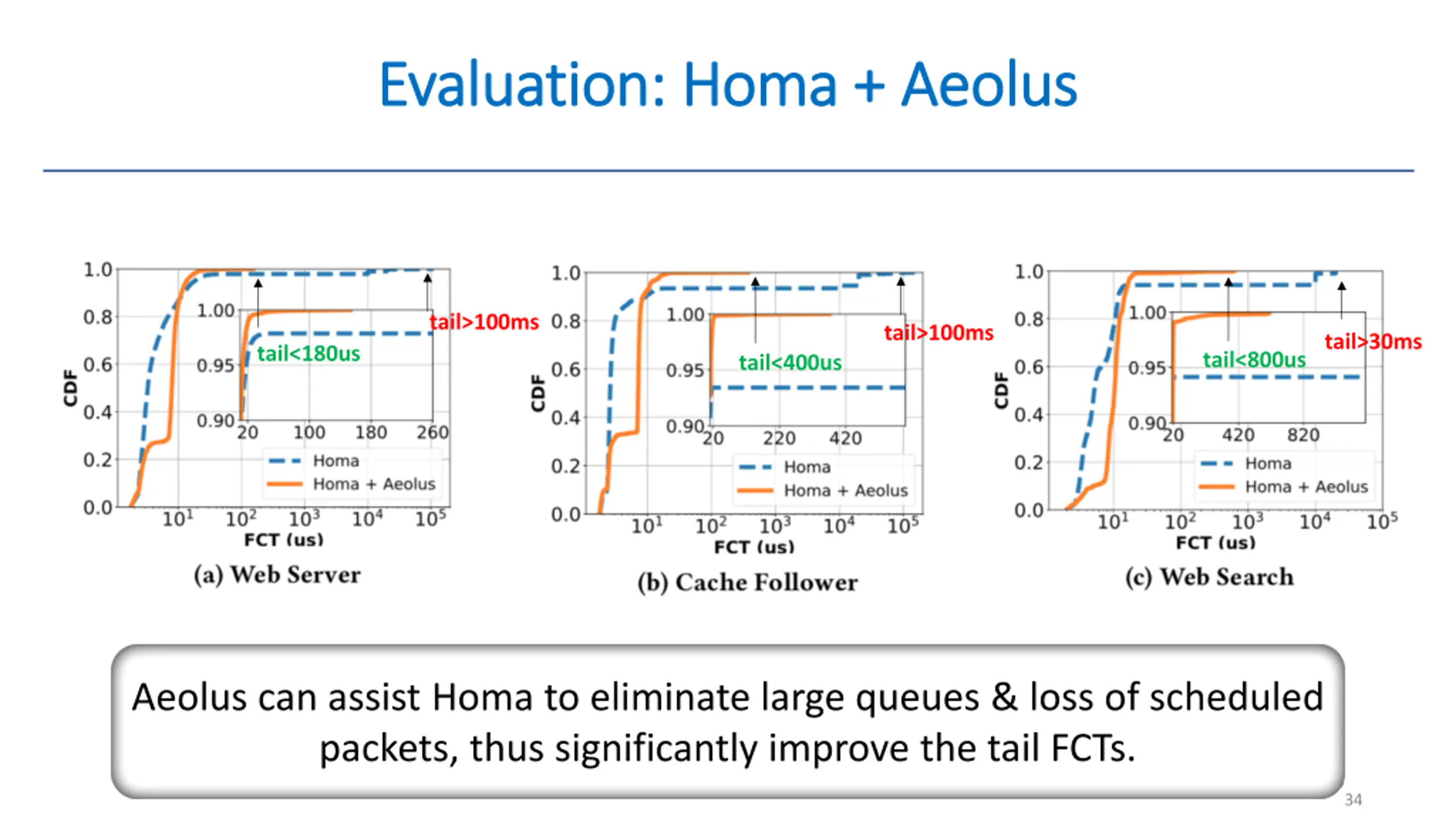 Evaluation: Evaluation: ExpressPass ExpressPass + Aeolus + Aeolus 80% 60% 30% Aeolus assists ExpressPass to significantly speed up small flows by removing 1 RTT extra delay 33